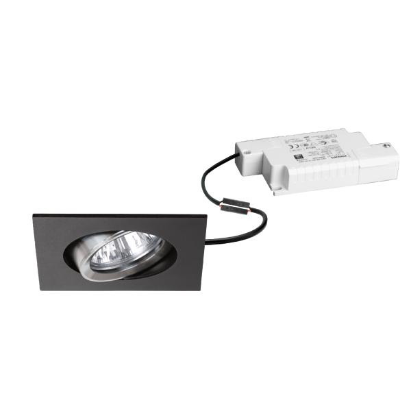 LED-Einbaustrahlerset, Phasenabschnitt dimmbar, schwarz matt / alu matt, quadratisch. Ausgeführt in kompakter Bauform für werkzeuglose Schnellmontage zum Deckeneinbau. Set inkl. Konverter für 230 V-Netzspannung, Phasenabschnitt dimmbar, Maße Konverter: L 110 x B 50 x H 19 mm Ausführung: ohne Fassung, Montageart: Einbaumontage, Montageort: Deckenmontage, Material: Aluminium / Glas / Kunststoff, Schutzart raumseitig: nach DIN EN 60529: IP20, Schutzklasse: (EN 61140) II, Spannung: 230V AC 50Hz, Leistung: 6 W, Anzahl der Leuchtmittel / Fassungen: 1 Stück, Lichtstrom: 730 lm, Farbtemperatur: 3.000 K, Abstrahlwinkel: 38°, Verstellbarkeit: schwenkbar, Mit Betriebsgerät: Ja, Dimmbar: Ja, Art der Dimmung: Phasenabschnitt.