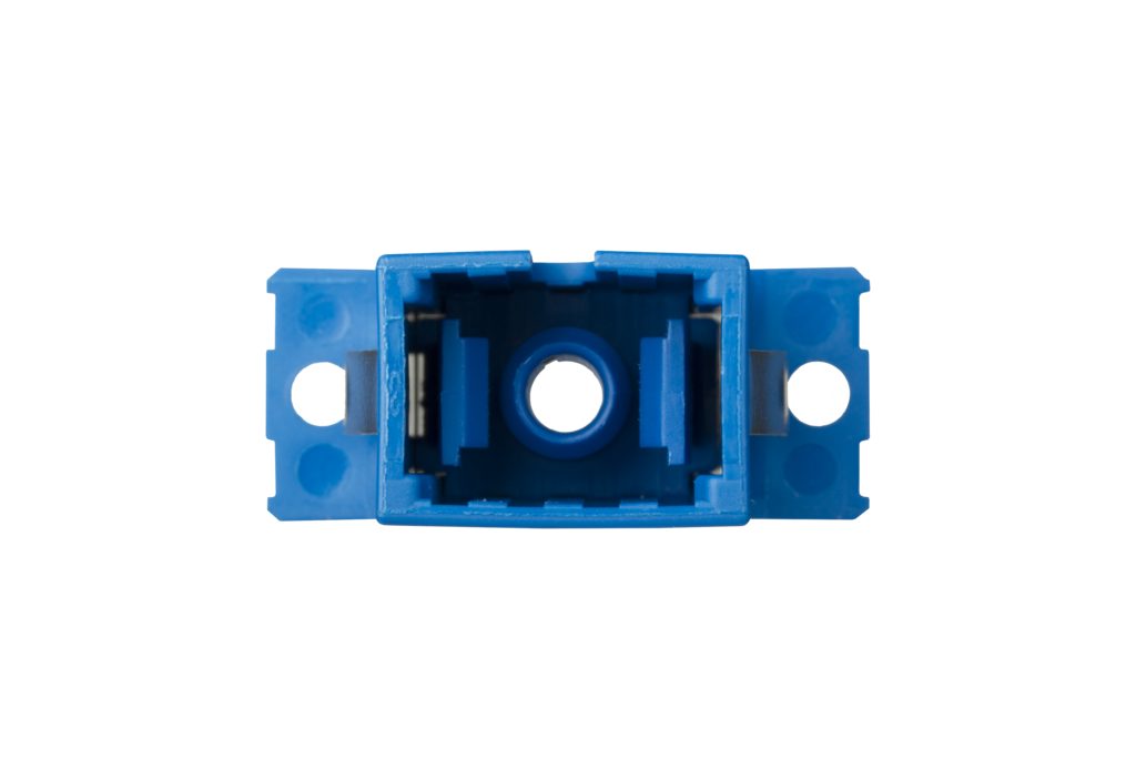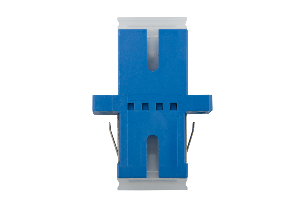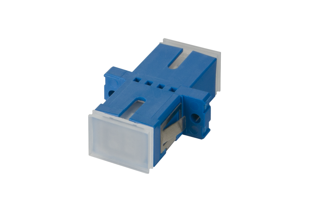 SC-Simplex-Kupplung aus Kunststoff, mit Metall-Clip, geschlitzte Führungshülse aus Keramik für Singlemode- und Multimode-Anwendungen, mit transparenten Staubschutzkappen für bessere Sichtbarkeit beim Rotlicht-Test, hohe Materialstabilität, Oberflächenqualität und Lebensdauer, Lebensdauer min. 1000 Steckzyklen bei Führungshülse aus Keramik, Schrauben und Muttern im Lieferumfang enthalten, Varianten: blau (SM), grün (SM APC), violett (OM4), aqua (OM3), beige (OM2), jeweils einzeln verpackt oder zu 50 Stück