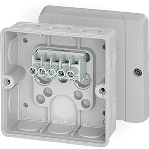 Kabelabzweigkästen aus hochwertigem Thermoplast für Aufputz-Anwendungen in Gebäuden oder die geschützte Installation im Freien. Kabeleinführung über elastische Dichtmembranen, einfach Leiter durchstecken, kein Lochwerkzeug erforderlich. Deckelbefestigung mit V2A-Schrauben. Mit Schraubklemmen bis 4 mm², 5-polig.