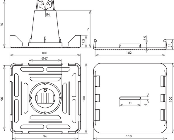 Dachleitungshalter mit einfacher Leitungshalterung Typ KF, zum Einklemmen in Dachbahnenstreifen (Stärke bis 2,5 mm), der mit der Dachbahn verschweißt oder verklebt ist. Zur Befestigung von Rundleitern oder Bändern (mit Adapter) mit loser Leitungsführung auf Flachdächern. Ausführung mit Grundplatte aus wetterbeständigem Kunststoff, UV-stabilisiert und halogenfrei.