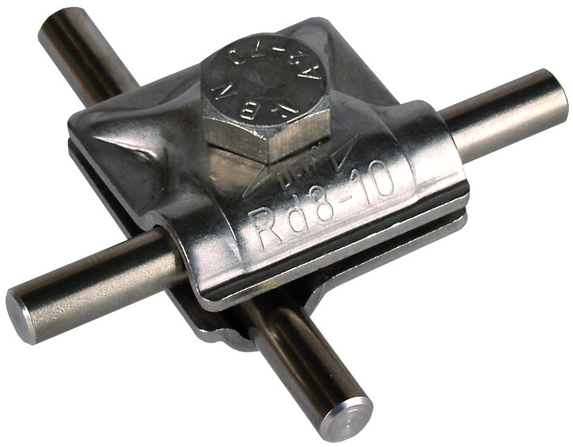 MehrzweckVerbindungs-Klemme nach DIN EN 62561-1, zur universellen Verwendung als Kreuz-, T- und Parallelklemme von Rundleitern. Ausführung zweiteilig mit Sechskantschraube und Gewinde im Unterteil.