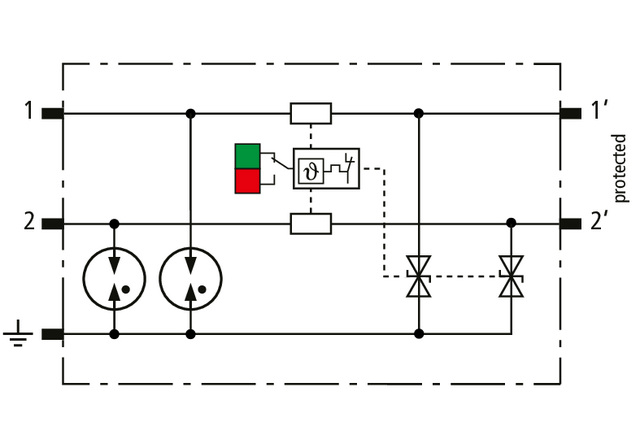 Platzsparender, modularer Kombi-Ableiter in 6 mm Baubreite und Push-in Anschlusstechnik mit Statusanzeige zum Schutz von 2 Einzeladern mit gemeinsamen Bezugspotential sowie unsymmetrischer Schnittstellen. Mit Signaltrennung für Wartungszwecke.
