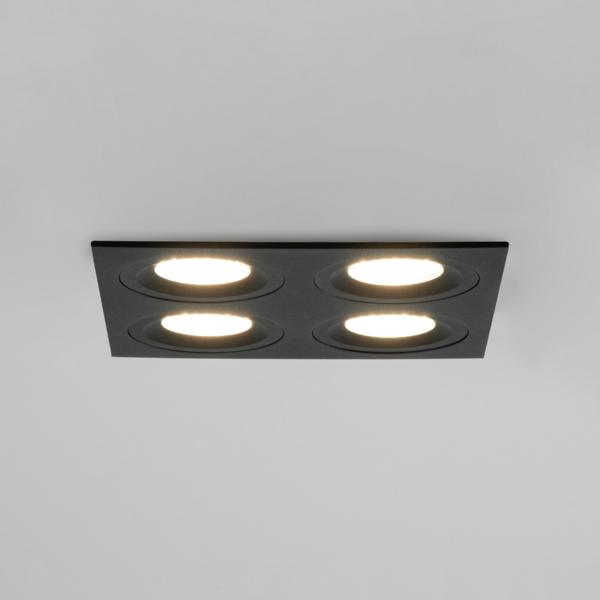 Einbaugehäuse, quadratisch, bündig, 4-fach, mit Modulhalterungen bündig, starr, IP44, ohne LED-Module, strukturschwarz, quadratisch. Ausgeführt in kompakter Bauform für werkzeuglose Schnellmontage zum Deckeneinbau. Alle Brumberg MR16-LED-Module sind für die Einbaueinheit M1 bis zur maximal angegebenen Leistung einsetzbar. Die Einbautiefe der Leuchte richtet sich nach den jeweils verwendeten LED-Modulen. Die LED-Module sind im Lieferumfang der Einbaueinheit nicht enthalten. Ausführung: ohne Fassung, Montageart: Einbaumontage, Montageort: Deckenmontage, Material: Aluminium, Schutzart raumseitig: nach DIN EN 60529: IP44, Schutzklasse: (EN 61140) III, Leistung: 13 W, Anzahl der Leuchtmittel / Fassungen: 4 Stück, Verstellbarkeit: nicht verstellbar, ohne Betriebsgerät, Dimmbar: Abhängig vom Betriebsgerät, Art der Dimmung: Abhängig vom Betriebsgerät.