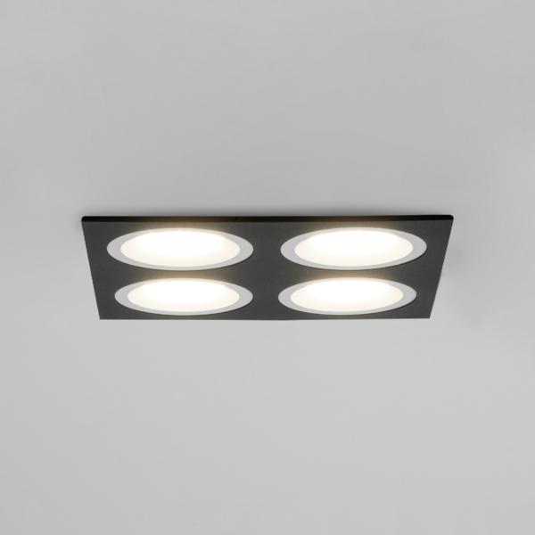 Einbaugehäuse, quadratisch, bündig, 4-fach, mit Modulhalterungen bündig, starr, IP44, ohne LED-Module, außen strukturschwarz / innen strukturweiß , quadratisch. Ausgeführt in kompakter Bauform für werkzeuglose Schnellmontage zum Deckeneinbau. Alle Brumberg MR16-LED-Module sind für die Einbaueinheit M1 bis zur maximal angegebenen Leistung einsetzbar. Die Einbautiefe der Leuchte richtet sich nach den jeweils verwendeten LED-Modulen. Die LED-Module sind im Lieferumfang der Einbaueinheit nicht enthalten. Ausführung: ohne Fassung, Montageart: Einbaumontage, Montageort: Deckenmontage, Material: Aluminium, Schutzart raumseitig: nach DIN EN 60529: IP44, Schutzklasse: (EN 61140) III, Leistung: 13 W, Anzahl der Leuchtmittel / Fassungen: 4 Stück, Verstellbarkeit: nicht verstellbar, ohne Betriebsgerät, Dimmbar: Abhängig vom Betriebsgerät, Art der Dimmung: Abhängig vom Betriebsgerät.