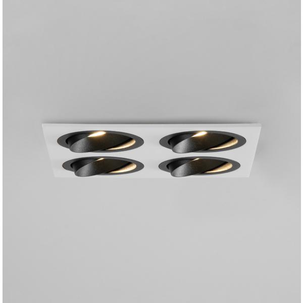 Einbaugehäuse, quadratisch, bündig, 4-fach, mit Modulhalterungen vertieft, schwenkbar, ohne LED-Module, außen strukturweiß / innen strukturschwarz, quadratisch. Ausgeführt in kompakter Bauform für werkzeuglose Schnellmontage zum Deckeneinbau. Alle Brumberg MR16-LED-Module sind für die Einbaueinheit M1 bis zur maximal angegebenen Leistung einsetzbar. Die Einbautiefe der Leuchte richtet sich nach den jeweils verwendeten LED-Modulen. Die LED-Module sind im Lieferumfang der Einbaueinheit nicht enthalten. Ausführung: ohne Fassung, Montageart: Einbaumontage, Montageort: Deckenmontage, Material: Aluminium, Schutzart raumseitig: nach DIN EN 60529: IP20, Schutzklasse: (EN 61140) III, Leistung: 13 W, Anzahl der Leuchtmittel / Fassungen: 4 Stück, Verstellbarkeit: schwenkbar, ohne Betriebsgerät, Dimmbar: Abhängig vom Betriebsgerät, Art der Dimmung: Abhängig vom Betriebsgerät.