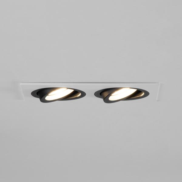 Einbaugehäuse, rechteckig, bündig, 2-fach, mit Modulhalterungen bündig, schwenkbar, ohne LED-Module, außen strukturweiß / innen strukturschwarz, quadratisch. Ausgeführt in kompakter Bauform für werkzeuglose Schnellmontage zum Deckeneinbau. Alle Brumberg MR16-LED-Module sind für die Einbaueinheit M1 bis zur maximal angegebenen Leistung einsetzbar. Die Einbautiefe der Leuchte richtet sich nach den jeweils verwendeten LED-Modulen. Die LED-Module sind im Lieferumfang der Einbaueinheit nicht enthalten. Ausführung: ohne Fassung, Montageart: Einbaumontage, Montageort: Deckenmontage, Material: Aluminium, Schutzart raumseitig: nach DIN EN 60529: IP20, Schutzklasse: (EN 61140) III, Leistung: 13 W, Anzahl der Leuchtmittel / Fassungen: 2 Stück, Verstellbarkeit: schwenkbar, ohne Betriebsgerät, Dimmbar: Abhängig vom Betriebsgerät, Art der Dimmung: Abhängig vom Betriebsgerät.