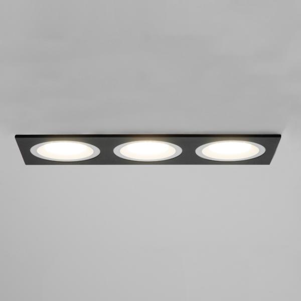 Einbaugehäuse, rechteckig, bündig, 3-fach, mit Modulhalterungen bündig, starr, IP44, ohne LED-Module, außen strukturschwarz / innen strukturweiß , quadratisch. Ausgeführt in kompakter Bauform für werkzeuglose Schnellmontage zum Deckeneinbau. Alle Brumberg MR16-LED-Module sind für die Einbaueinheit M1 bis zur maximal angegebenen Leistung einsetzbar. Die Einbautiefe der Leuchte richtet sich nach den jeweils verwendeten LED-Modulen. Die LED-Module sind im Lieferumfang der Einbaueinheit nicht enthalten. Ausführung: ohne Fassung, Montageart: Einbaumontage, Montageort: Deckenmontage, Material: Aluminium, Schutzart raumseitig: nach DIN EN 60529: IP44, Schutzklasse: (EN 61140) III, Leistung: 13 W, Anzahl der Leuchtmittel / Fassungen: 3 Stück, Verstellbarkeit: nicht verstellbar, ohne Betriebsgerät, Dimmbar: Abhängig vom Betriebsgerät, Art der Dimmung: Abhängig vom Betriebsgerät.