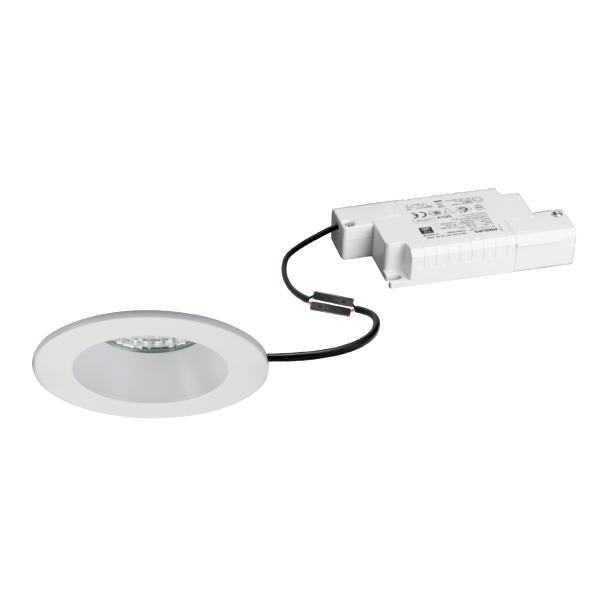 LED-Einbaudownlightset, IP54, Phasenabschnitt dimmbar, weiß matt, rund. Ausgeführt in kompakter Bauform für werkzeuglose Schnellmontage zum Deckeneinbau. Set inkl. Konverter für 230 V-Netzspannung, Phasenabschnitt dimmbar, Maße Konverter: L 110 x B 50 x H 19 mm Ausführung: ohne Fassung, Montageart: Einbaumontage, Montageort: Deckenmontage, Material: Aluminium / Glas / Kunststoff, Schutzart raumseitig: nach DIN EN 60529: IP54, Schutzklasse: (EN 61140) II, Spannung: 230V AC 50Hz, Leistung: 6 W, Anzahl der Leuchtmittel / Fassungen: 1 Stück, Lichtstrom: 680 lm, Farbtemperatur: 2.700 K, Abstrahlwinkel: 38°, Verstellbarkeit: nicht verstellbar, Mit Betriebsgerät: Ja, Dimmbar: Ja, Art der Dimmung: Phasenabschnitt.