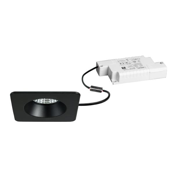 LED-Einbaudownlightset, IP54, Phasenabschnitt dimmbar, schwarz matt, quadratisch. Ausgeführt in kompakter Bauform für werkzeuglose Schnellmontage zum Deckeneinbau. Set inkl. Konverter für 230 V-Netzspannung, Phasenabschnitt dimmbar, Maße Konverter: L 110 x B 50 x H 19 mm Ausführung: ohne Fassung, Montageart: Einbaumontage, Montageort: Deckenmontage, Material: Aluminium / Glas / Kunststoff, Schutzart raumseitig: nach DIN EN 60529: IP54, Schutzklasse: (EN 61140) II, Spannung: 230V AC 50Hz, Leistung: 6 W, Anzahl der Leuchtmittel / Fassungen: 1 Stück, Lichtstrom: 680 lm, Farbtemperatur: 2.700 K, Abstrahlwinkel: 38°, Verstellbarkeit: nicht verstellbar, Mit Betriebsgerät: Ja, Dimmbar: Ja, Art der Dimmung: Phasenabschnitt.- Hersteller-Artikelnummer (MPN)