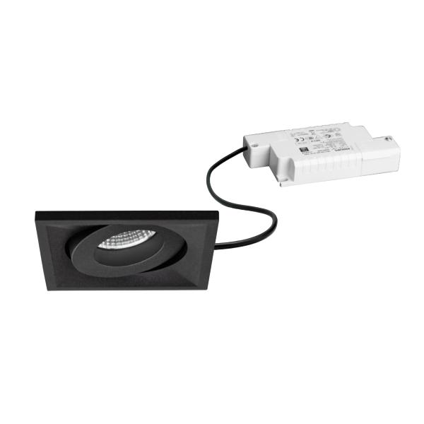 LED-Einbaustrahlerset, Phasenabschnitt dimmbar, strukturschwarz, quadratisch. Ausgeführt in kompakter Bauform für werkzeuglose Schnellmontage zum Deckeneinbau. Set inkl. Konverter für 230 V-Netzspannung, Phasenabschnitt dimmbar, Maße Konverter: L 110 x B 50 x H 19 mm Montageart: Einbaumontage, Montageort: Deckenmontage, Material: Aluminium / Polycarbonat, Schutzart raumseitig: nach DIN EN 60529: IP20, Schutzklasse: (EN 61140) II, Spannung: 230V AC 50Hz, Leistung: 7 W, Anzahl der Leuchtmittel / Fassungen: 1 Stück, Lichtstrom: 680 lm, Farbtemperatur: 3.000 K, Abstrahlwinkel: 40°, Verstellbarkeit: schwenkbar, Mit Betriebsgerät: Ja, Dimmbar: Ja, Art der Dimmung: Phasenabschnitt.