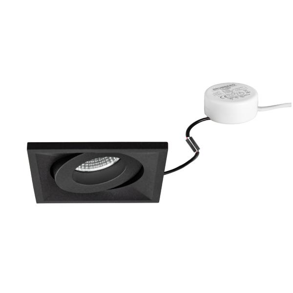 LED-Einbaustrahlerset, Phasenabschnitt dimmbar (Rundkonverter), strukturschwarz, quadratisch. Ausgeführt in kompakter Bauform für werkzeuglose Schnellmontage zum Deckeneinbau. Set inkl. Konverter für 230 V-Netzspannung, Phasenabschnitt dimmbar, Maße Konverter: D 51 x H 24 mm Montageart: Einbaumontage, Montageort: Deckenmontage, Material: Aluminium / Polycarbonat, Schutzart raumseitig: nach DIN EN 60529: IP20, Schutzklasse: (EN 61140) II, Spannung: 230V AC 50Hz, Leistung: 7 W, Anzahl der Leuchtmittel / Fassungen: 1 Stück, Lichtstrom: 680 lm, Farbtemperatur: 3.000 K, Abstrahlwinkel: 40°, Verstellbarkeit: schwenkbar, Mit Betriebsgerät: Ja, Dimmbar: Ja, Art der Dimmung: Phasenabschnitt.