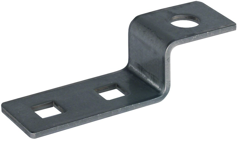 Endstück zum Anschrauben an Erdungsfestpunkt, für den Anschluss z. B. einer Potentialausgleichsschiene oder zum Anschließen von Konstruktionsteilen (z. B. Stahlträger oder dgl.) durch Anschrauben. Ausführung mit Vierkantlöchern (11 x 11 mm), für Anschluss Rundleiter z. B. mit KS-Verbinder, für Flachleiter mit Schrauben und Muttern M10 oder M12.