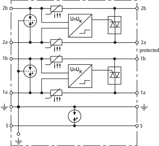 Kompakter Kombiableiter im Kunststoff Aufputz-Gehäuse mit actiVsense-Technologie zum Schutz von 2 Doppeladern mit gleicher oder unterschiedlicher Signalspannung symmetrischer Schnittstellen mit galvanischer Trennung, wahlweise direkte oder indirekte Schirmerdung.