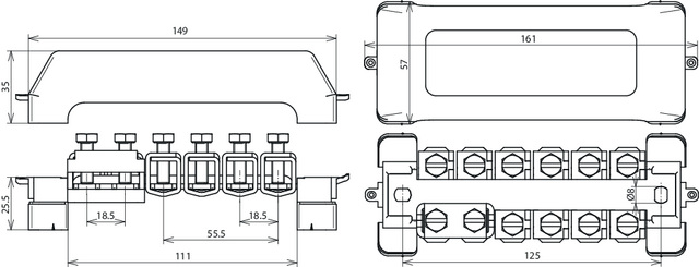 Potentialausgleichsschiene nach DIN EN 62561-1, für den Schutz- und Funktionspotentialausgleich nach DIN VDE 0100-410/540 (Haupterdungsschiene) und den Blitzschutz-Potentialausgleich nach DIN EN 62305-3 (VDE 0185-305-3). Ausführung Standard, geprüft nach DIN VDE 0618-1, mit CE-Zeichen, Aufsteckklemmen St/gal Zn, Befestigungsböcke und Abdeckhaube aus Kunststoff, grau (halogenfrei), Abdeckung plombierbar und beschriftbar.