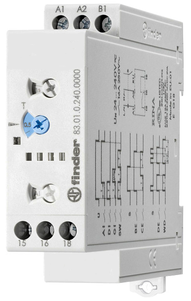 Multifunktionszeitrelais für DIN-Schiene, 22,5 mm breit, 1 Wechsler für 16 A / 250 V AC, Kontaktmaterial AgNi, Funktionen: Ansprechverzögerung, Einschaltwischer, Impulsrelais (Blinker) symmetrisch impulsbeginnend, Rückfallverzögerung, Ansprech-/Rückfallverzögerung, Einschaltwischer mit B1, Watchdog-Funktion (WD) - schaltet ab, wenn der Startkontakt länger als die eingestellte Zeit geschlossen bleibt, 8 Zeitbereiche: 0,05 s - 10 Tage, Versorgungsspannung: 24-240 V AC/DC (50/60 Hz) Relaisschutzart: IP 20