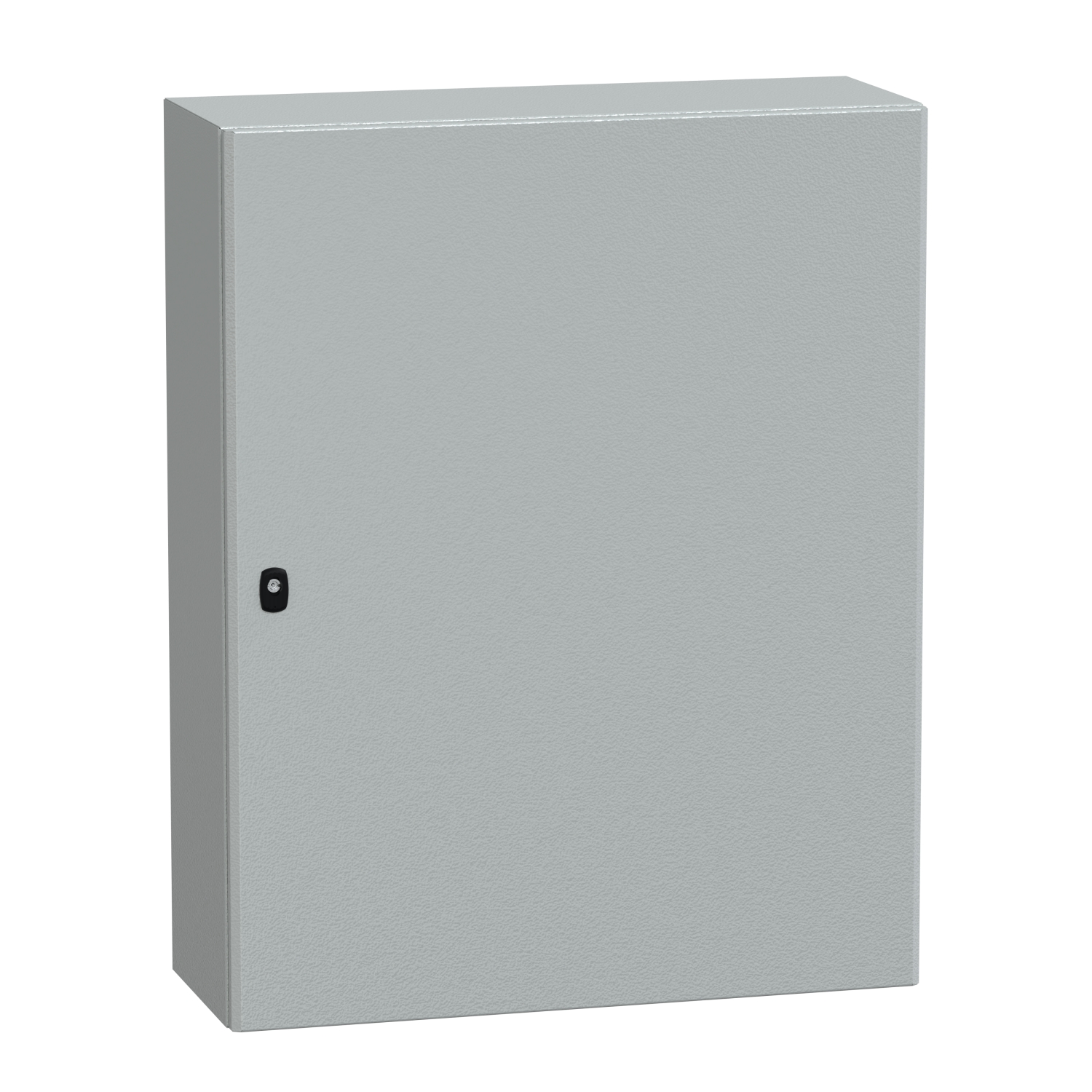 Spacial S3D Wandgehäuse aus Stahl mit glatter Tür. Einteiliges Gehäuse, inkl. Montageplatte. 3-Punkt-Verschlusssystem mit Handgriff und 3-mm-Doppelstabschlosseinsatz. Aus Stahl, Epoxid-Polyester-Pulverlackierung. Schutzart IP 66, IK10, Grau RAL 7035.