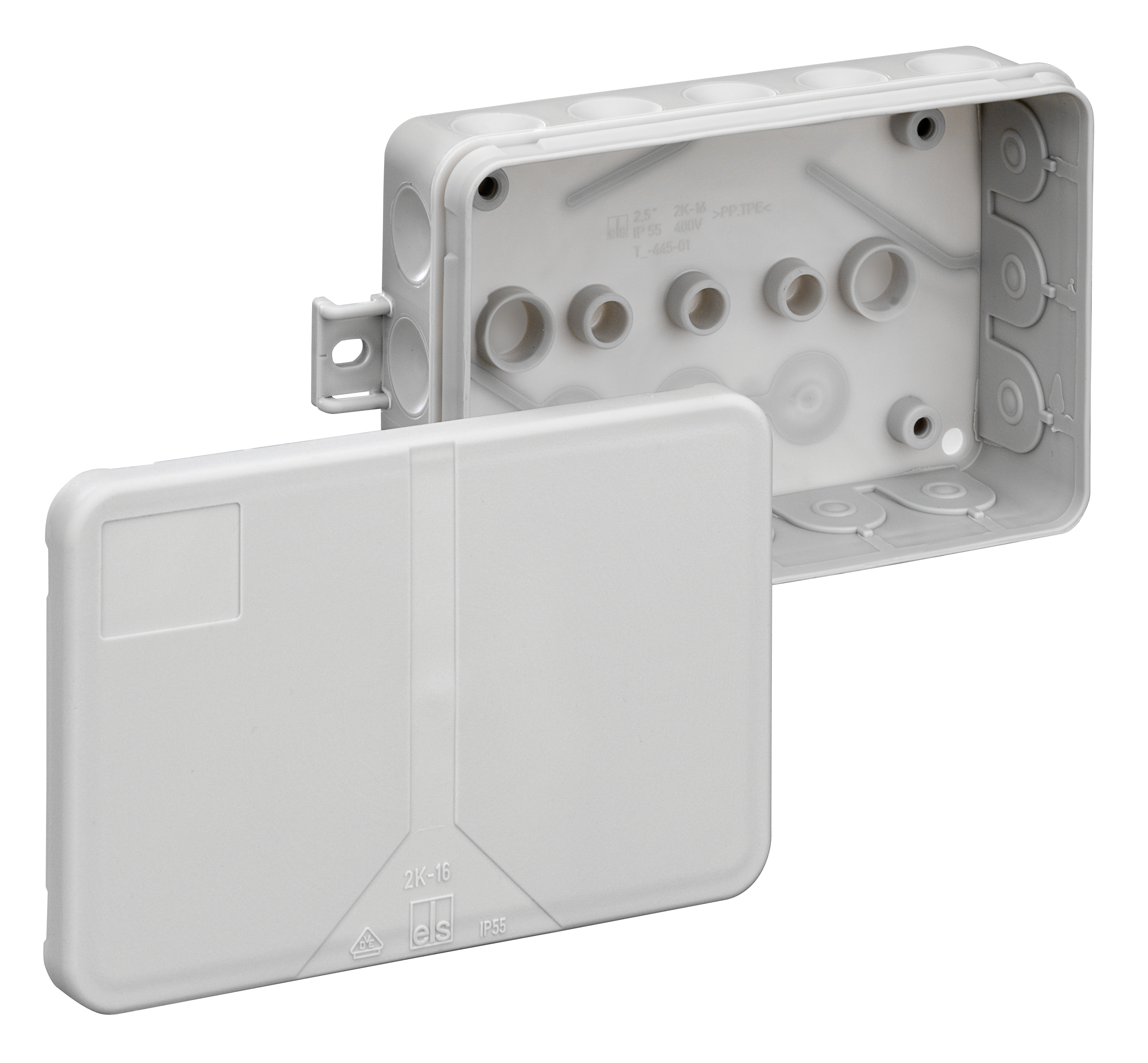 Abzweigdose, mit Schutzart IP55, Nennquerschnitt 2,5mm², Ui=400 V AC, zertifiziert durch VDE (DIN EN 60670-1/-22 (VDE 0606-1/-22)), selbstdichtende, weiche Einführungsmembranen, Dichtbereich 2-14mm, (3 rückseitig, 16 seitlich), außenliegende Befestigungsstellen, für Standardinstallationen im Innenbereich, grau, ohne KlemmenAbmessungen: 130 x 85 x 37mm