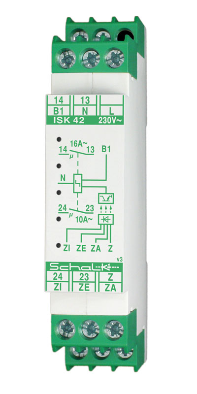 In Elektro-Installationen mit mehreren Unterverteilungen und Fehlerstrom-Schutzschaltern kann mit den dafür entwickelten Schaltgeräten ISK 41, ISK 42 eine wirtschaftliche Zentral-EIN-AUS-Steuerung aufgebaut werden. Die Zentral-Steuereingänge sind durch Ein- und Ausgänge der Versorgungsseite galvanisch getrennt und können mit Spannungen von 8-230V AC oder DC angesteuert werden. Der ISK 42 verfügt zusaätzlich über einen zweiten potentialfreien Relaiskontakt (10A Schließer) und eunen Zentral-Impulseingang., Maße: 18x55mm, 230V AC - 2S pf 16/10A