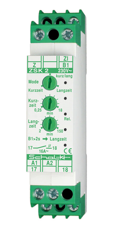 Der ZSK 2 vereint als moderner Lichtzeit-Impulsschalter (Stromstoßschalter) ein hohes Maß an Komfort, Flexibilität und Funktionsvielfalt bei einfacher Handhabung und Bedienung. Durch kurzes bzw. längeres Betätigen des Lichttasters kann zwischen zwei voneinander unabhängig einstellbaren Zeitbereichen ausgewählt werden. Damit wird eine individuell konfigurierbare Kurzzeit- / Langzeitumschaltung in einem Bereich von 0,25 bis 150 Minuten ermöglicht. Durch erneute Betätigung des Lichttasters wird ein sofortiges Abschalten der Verbraucher erreicht. Zwei Betriebsarten ermöglichen ein Sperren der Langzeitumschaltung. Als weitere Besonderheit beinhaltet der ZSK 2 einen zusätzlichen, von den übrigen Ein- und Ausgängen galvanisch getrennten Fremdspannungseingang (8v-230V UC), der z.B. von einer Türsprechanlage ohne Koppelrelais angesteuert werden kann., Maße: 18x55mm, 230V AC - 1 Schließer (potenzialfrei) 16A, tvK/tvL -18/-150min