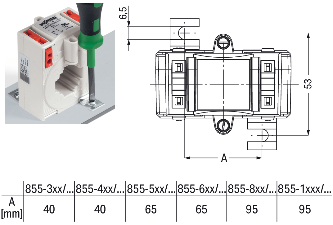 Aufsteck-Stromwandler Primärer Bemessungsstrom 150 A Sekundärer Bemessungsstrom 5 A Bemessungsleistung 5 VA Genauigkeitsklasse 1Kurzbeschreibung: Aufsteck-Stromwandler der Serie 855 sind induktive, nach dem Trafo-Prinzip arbeitende, 1-Leiter-Stromwandler. Aufgrund des angewendeten Messprinzips eignen sich Stromwandler dieses Typs zur ausschließlichen Verwendung in Wechselstromnetzen. Merkmale: Schraubenlose Anschlusstechnik mit CAGE-CLAMP®-Anschluss. Verschiedene Montagemöglichkeiten. Schockfest und rüttelsicher. Hohe mechanische Haltekräfte. Hohe Stromfestigkeit. Ständig mit 120 % des primären Nennstroms überlastbar. Niederspannungsstromwandler für Betriebsspannungen bis max. 1,2 kV. Einsatz in 690V-Netzen. UL (Recognized Components).