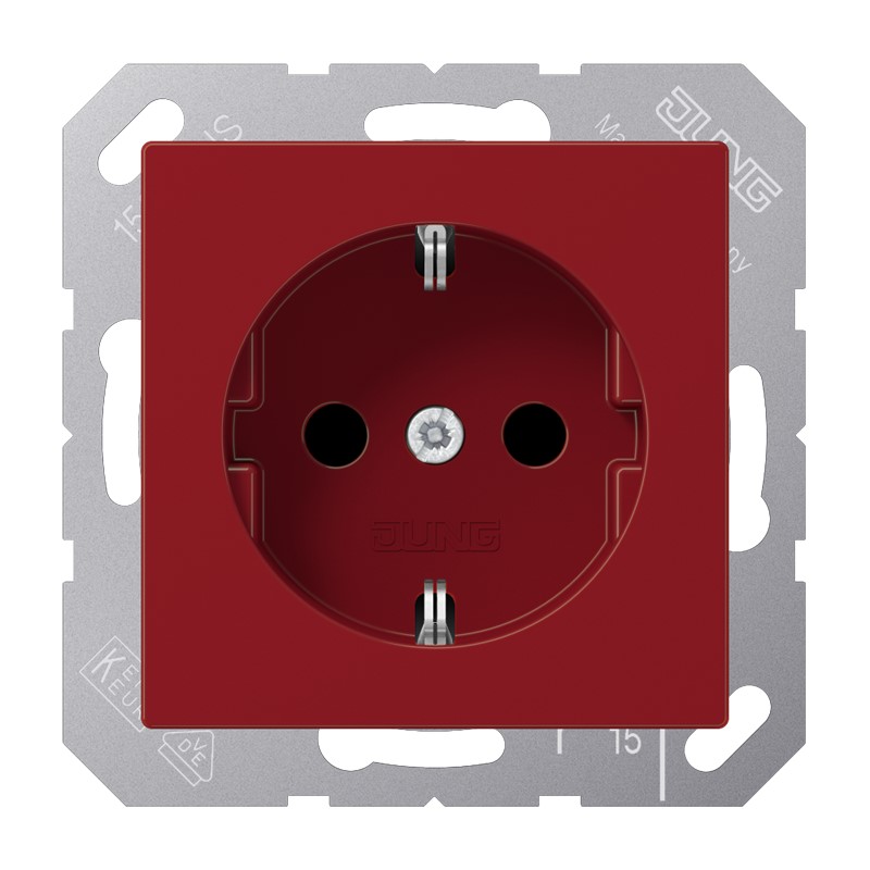 Schutzkontakt®-Steckdose, rot mit integriertem erhöhten Berührungsschutz (Safety Plus) mit Federklemmen für starre und unbehandelte flexible Leiter bis 2,5 mm2 Verbindungsklemmen nach DIN VDE 0620 Tragring, Krallen und Krallenschrauben sind über eine Erdungsschiene in die Schutzmaßnahme eingebunden. Material: Thermoplast Maße (B x H): 55 x 55 mm
