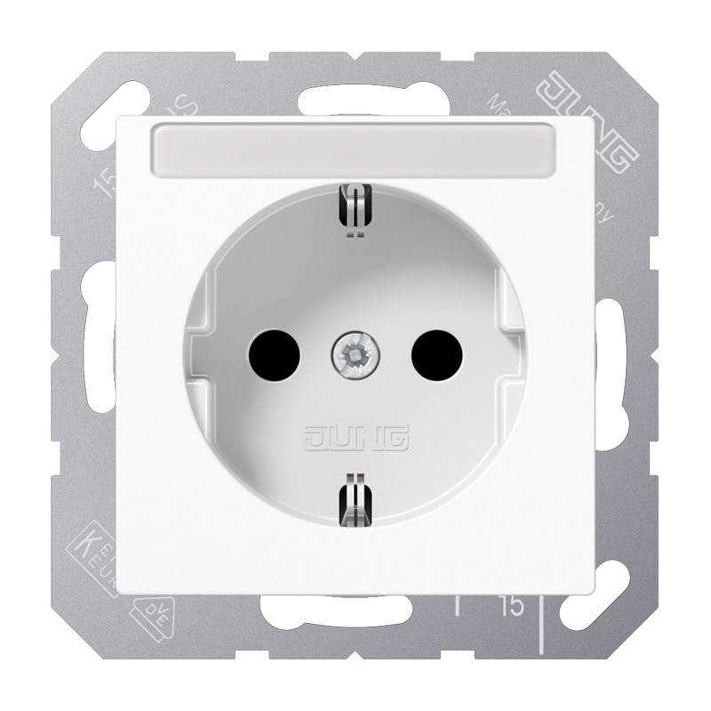 Schutzkontakt®-Steckdose, alpinweiß mit integriertem erhöhten Berührungsschutz (Safety Plus) mit Schriftfeld 6 x 46 mm mit Federklemmen für starre und unbehandelte flexible Leiter bis 2,5 mm2 Verbindungsklemmen nach DIN VDE 0620 Tragring, Krallen und Krallenschrauben sind über eine Erdungsschiene in die Schutzmaßnahme eingebunden. Ersatzteil: Transparente Abdeckung mit Einlage Art.-Nr.: A 20 NA Material: Thermoplast Maße (B x H): 55 x 55 mm