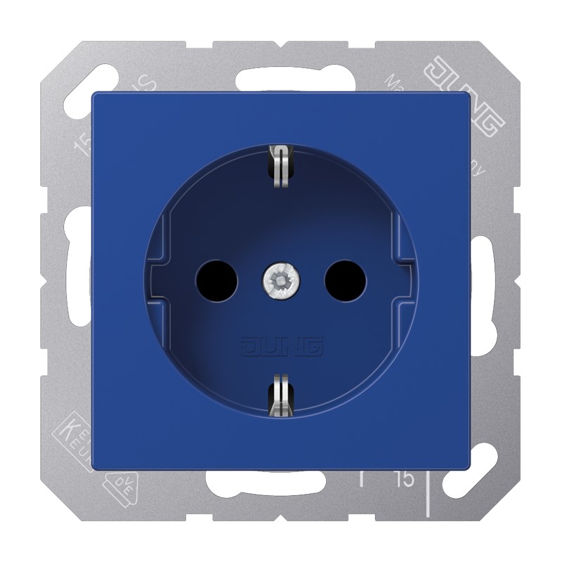 Schutzkontakt®-Steckdose, blau mit integriertem erhöhten Berührungsschutz (Safety Plus) mit Federklemmen für starre und unbehandelte flexible Leiter bis 2,5 mm2 Verbindungsklemmen nach DIN VDE 0620 Tragring, Krallen und Krallenschrauben sind über eine Erdungsschiene in die Schutzmaßnahme eingebunden. Material: Thermoplast Maße (B x H): 55 x 55 mm