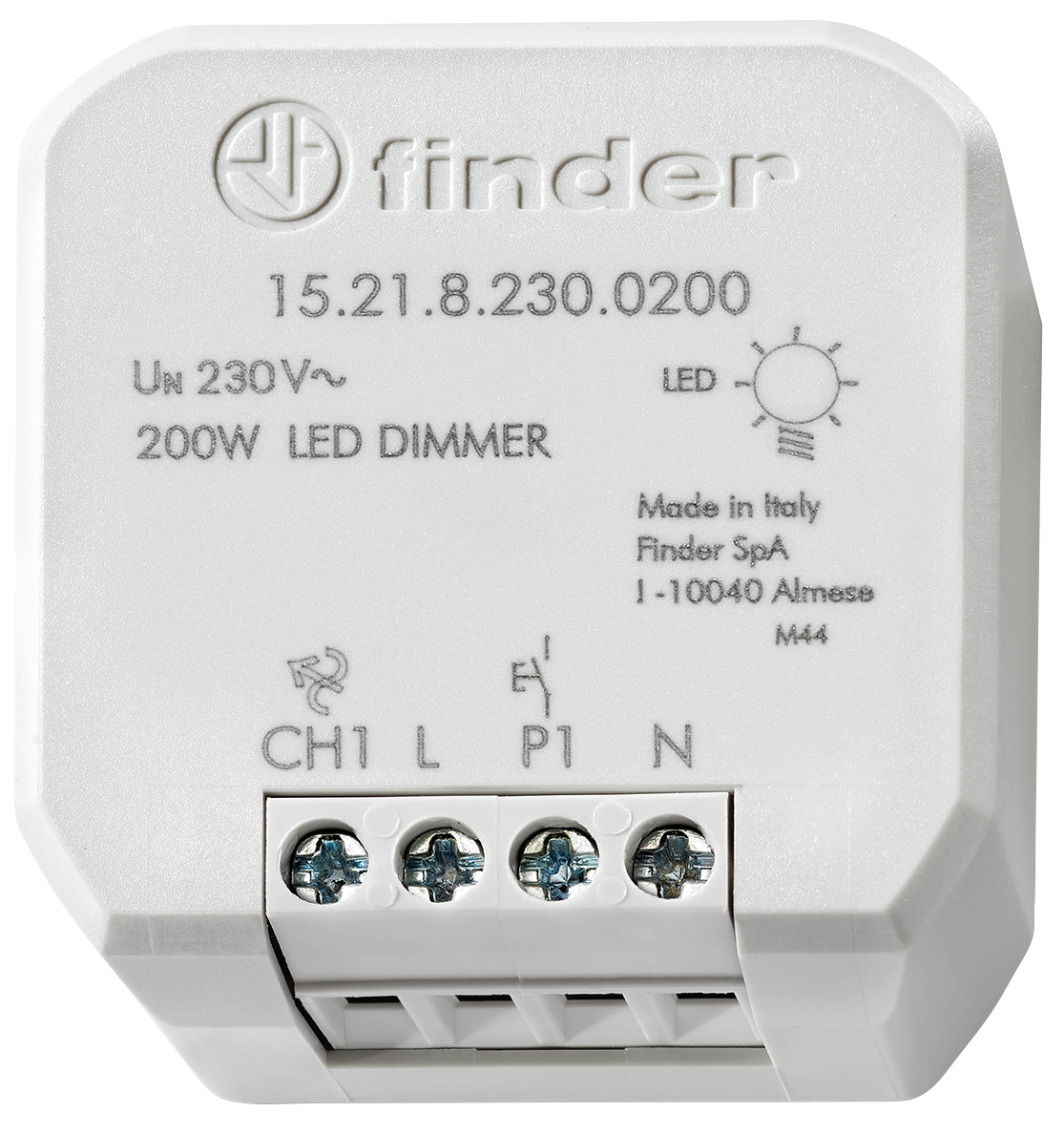 Dimmer, elektronisch, für Montage in Unterputzdosen oder tiefe Schalterdosen, Phasenan-/Phasenabschnitt-Steuerung, Lampenlasten: Glüh- und Halogenlampen (230 V) 200 W, dimmbare LED-Lampen 200 W, dimmbarer elektronischer Trafo für 12/24 V - LED 200 W, Dimmverfahren über Taster wählbar, dimmt linear, Versorgungsspannung 230 V AC