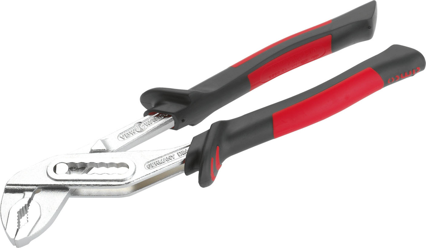 Wasserpumpenzange nach DIN ISO 8976, mit durchgestecktem Gelenk, selbstklemmend am Werkstück, mit gezahnter Aussparung (Brennerloch), aus Chrom-Vanadium-Stahl, mit Griffhüllen 250 mm (10")