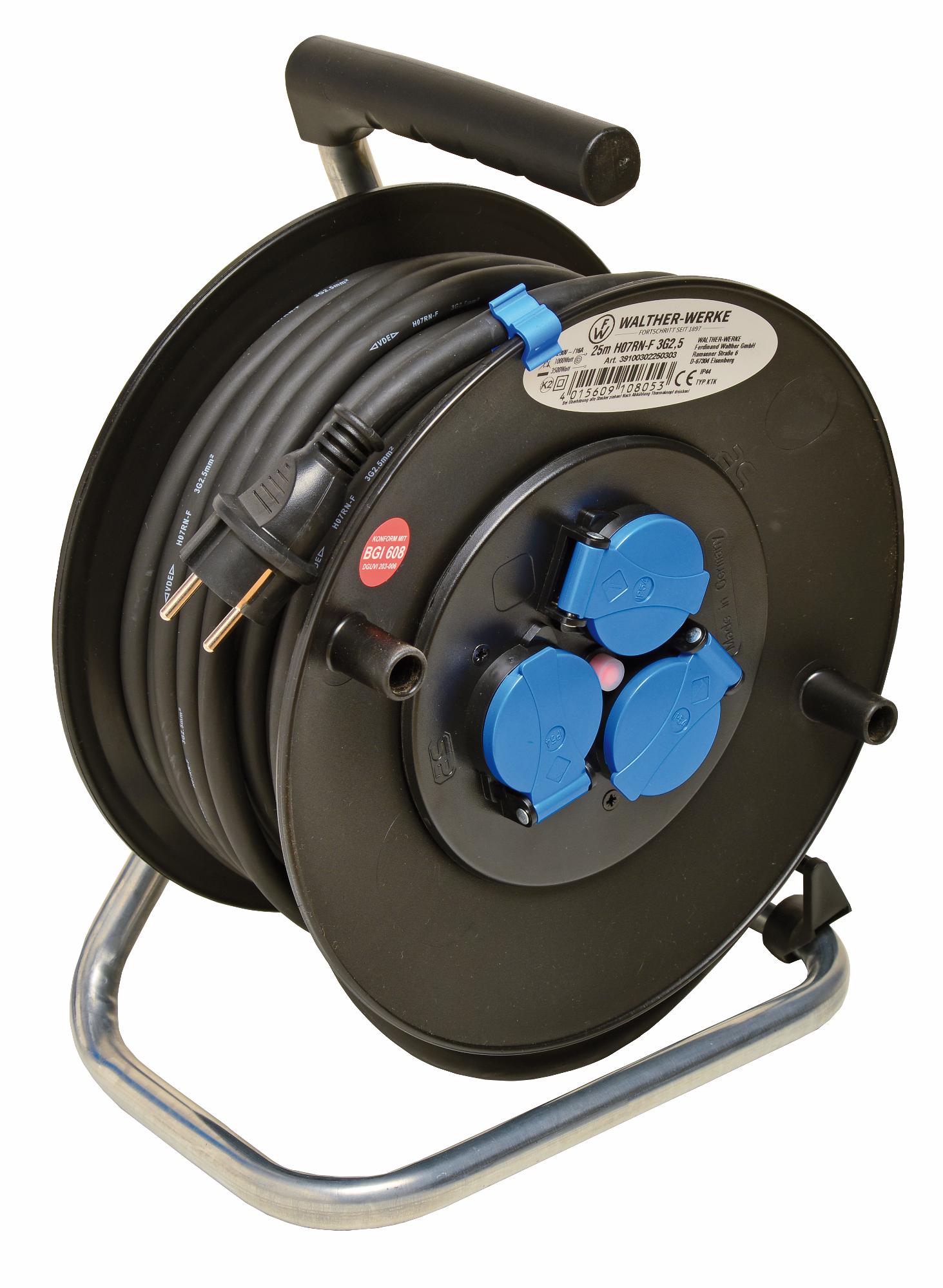 WALTHER Sicherheits-Kabeltrommel 230V mit Trommelkörper aus hochbruchfestem Spezialkunststoff stabiles, verzinktes Fußgestell mit geformten Haltegriff, Feststellbremse und Leitungsführung Gesamtschutzart: IP44 Bemessungsstrom: 16A Leistung bei aufgewickelter Leitung: 1500W Leistung bei abgewickelter Leitung: 3500W Abmessungen: 280 x 190 x 380mm (HxBxT) 285mm Durchmesser