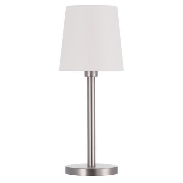 Tischleuchte, für E27-LED-Retrofit-Lampe, mit Stoffschirm, Höhe 520 mm, nickel matt / Schirm rohweiß, rund. Ausführung in kompakter Bauform für die harmonische Implementierung in stimmige, architektonische Raumkonzepte. Tischleuchte mit Stoffschirm, Schirmmaterial: Chintz, Oberfläche: nickel matt, Durchmesser: 200 mm, Höhe: 520 mm, ca. 1.000 mm sichtbare, schwarze Zuleitung mit Schnur zwischen Handschalter und Euroflachstecker. Weitere lieferbare Schirmfarben und Sonderlösungen finden Sie bei jedem Produkt online auf unserer Webseite als PDF. Ausführung: E27, Montageart: Anbaumontage, Montageort: Tischmontage, Schutzart raumseitig: nach DIN EN 60529: IP20, Schutzklasse: (EN 61140) I, Spannung: 230V AC 50Hz, Leistung: 15 W, Anzahl der Leuchtmittel / Fassungen: 1 Stück, ohne Betriebsgerät, Art der Dimmung: sonstige.