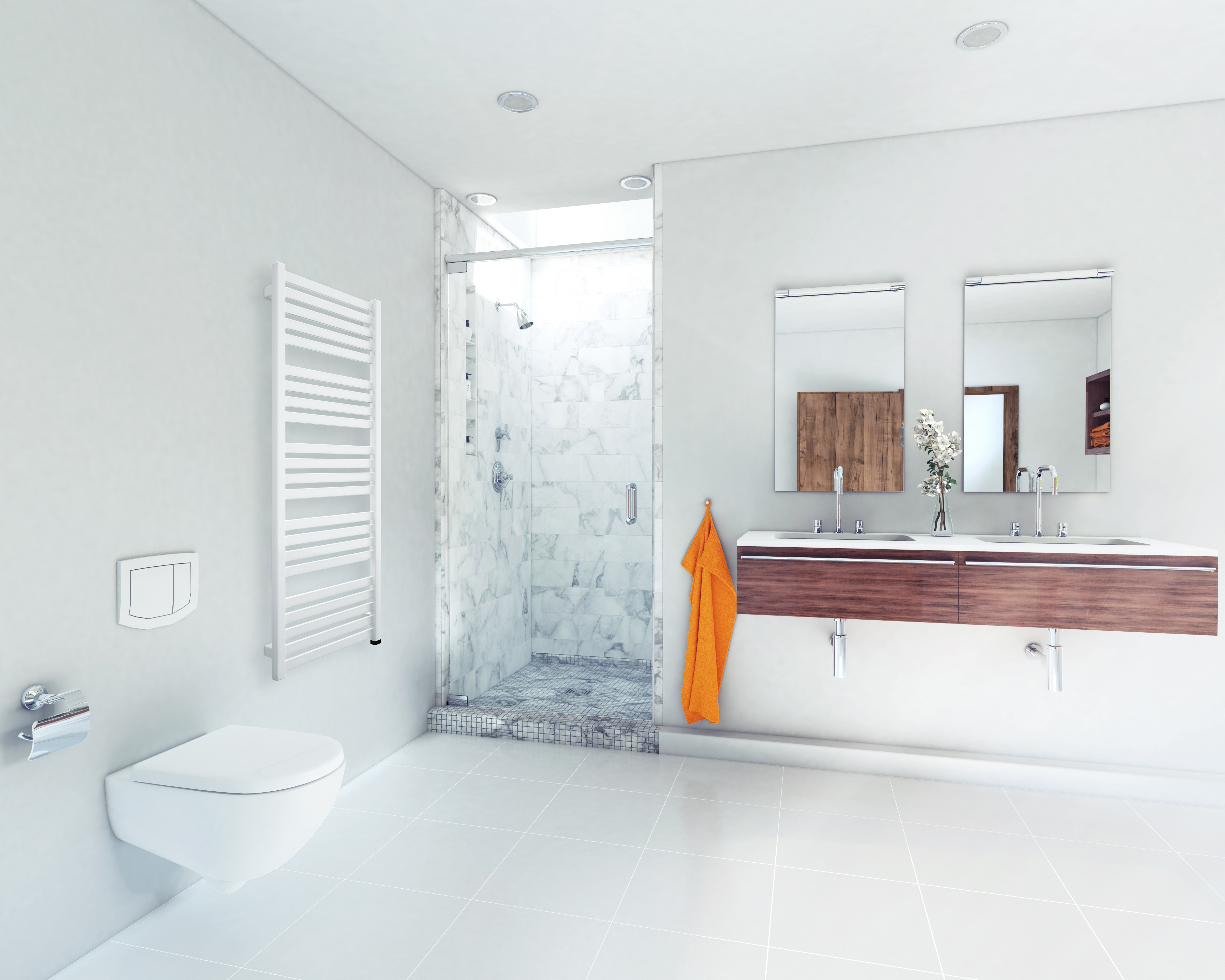 Der Badheizkörper BHK dient zur Erwärmung von Bädern und Handtüchern. Der Heizkörper in formschöner Ausführung, ohne sichtbare Schweißnähte, ist frostsicher bis -20 °C und mit Wärmeträgerflüssigkeit gefüllt. Der Thermostat regelt die Oberfläche des Heizkörper in 2 Stufen (45 °C und 60 °C). Das Gerät besitzt einen Ein-/Aus-Schalter mit LED-Anzeige sowie eine 2 Stunden-Timerfunktion. Optional ist die Funksteuerung BHK-TH erhältlich für Wochen- und Tagesprogramm sowie Temperatursturzerkennung - wodurch er Ökodesign-Richtlinien konform wird. Gerätetiefe: 85 mm, Schutzart: IP X5 Schutzklasse I, Farbe: Verkehrsweiß RAL 9016, Steckeranschlussleitung: 1.5 m rechts, CE konform. Bei diesem Produkt handelt es sich um einen Handtuchhalter mit einer Nennwärmeleistung von mehr als 250W um die verbindlichen Ökodesign Anforderungen der Verordnung (EU) 2024/1103 der Kommission zu erfüllen, muss es durch einen Regler ergänzt werden, der mindestens die folgenden Regelungsfunktionen erfüllt: elektronischer Raumtemperaturregler mit Wochentagsregelung (TW)
