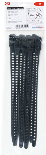 Elastischer Kabelbinder mit gerundeten Kanten. Flexibel auch bei niedrigen Temperaturen bis -20 °C. Kann wieder geöffnet und erneut verwendet werden. Doppelter Verschlusskopf zur Parallelbündelung. Dehnspannung ermöglicht sehr festen Sitz auf dem Bündel. Gleichmäßige Druckverteilung auf dem Bündel. Sicherer Halt auch in vertikaler Position verhindert das Herausgleiten des Bündels. Langlebig beim Verbau im Innenbereich. Aufgrund des elastischen und reißfesten Materials eignen sich diese Kabelbinder besonders für die Bündelung und Fixierung von vibrierenden, beweglichen oder pulsierenden Leitungen und Schläuchen, wie zum Beispiel in den Bereichen Windenergie, Bau- und Agrarmaschinen sowie Robotersystemen. Als Wiederöffnungsbinder finden sich zahlreiche Anwendungen für temporäre Befestigung im Bühnen- und Messebau oder auf Musikveranstaltungen. Im Montagewagen sorgt dieser Kabelbinder für Ordnung.