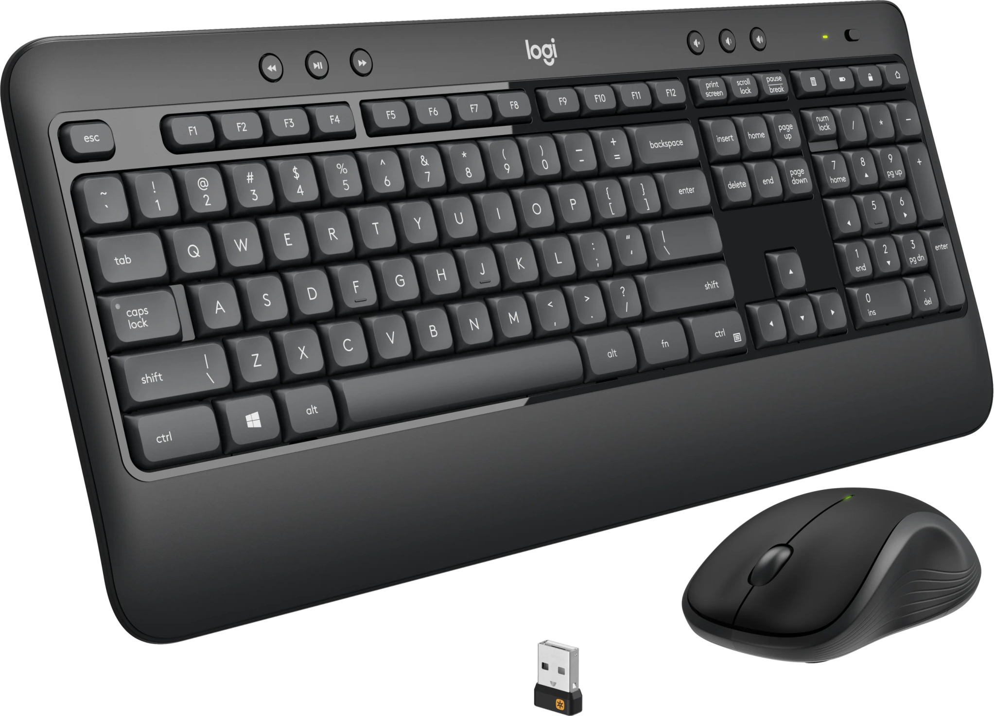 Das Tastatur-Maus-Set wurde speziell für Präzision, Bedienkomfort und Zuverlässigkeit entwickelt und bietet sofort ein vertrautes Benutzererlebnis. Die Tastatur in Standardgröße ist optimiert für Genauigkeit und reduzierte Tippgeräusche. Die Handballenauflage und die ausklappbaren Füße sorgen für hohen Bedienkomfort auch bei langen Arbeitsstunden - und die geschwungen geformte Maus passt sich an die Handfläche ideal an. Technische Daten - Anschluss: USB (Unifying-Empfänger) - Abmessungen: 457 x 194 x 24mm (Tastatur), 112 x 62 x 39mm (Maus) - Gewicht: 805g (Tastatur), 74g (Maus) - Reichweite: bis zu 10m - Batterietyp: 2x AA (Tastatur), 1x AA (Maus) - Batterielaufzeit: bis zu 36 Monate (Tastatur), bis zu 18 Monate (Maus)