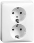 Doppel-Steckdose SCHUKO mit Steckklemmen 2-polig, 16 A 250 V, mit Verbindungsklemmen nach VDE 0620, für 58er Einbaudosen, mit voller Abdeckplatte für Einzelmontage Aufbauhöhe: 24 mm Abmessungen: B81 x L100 mm