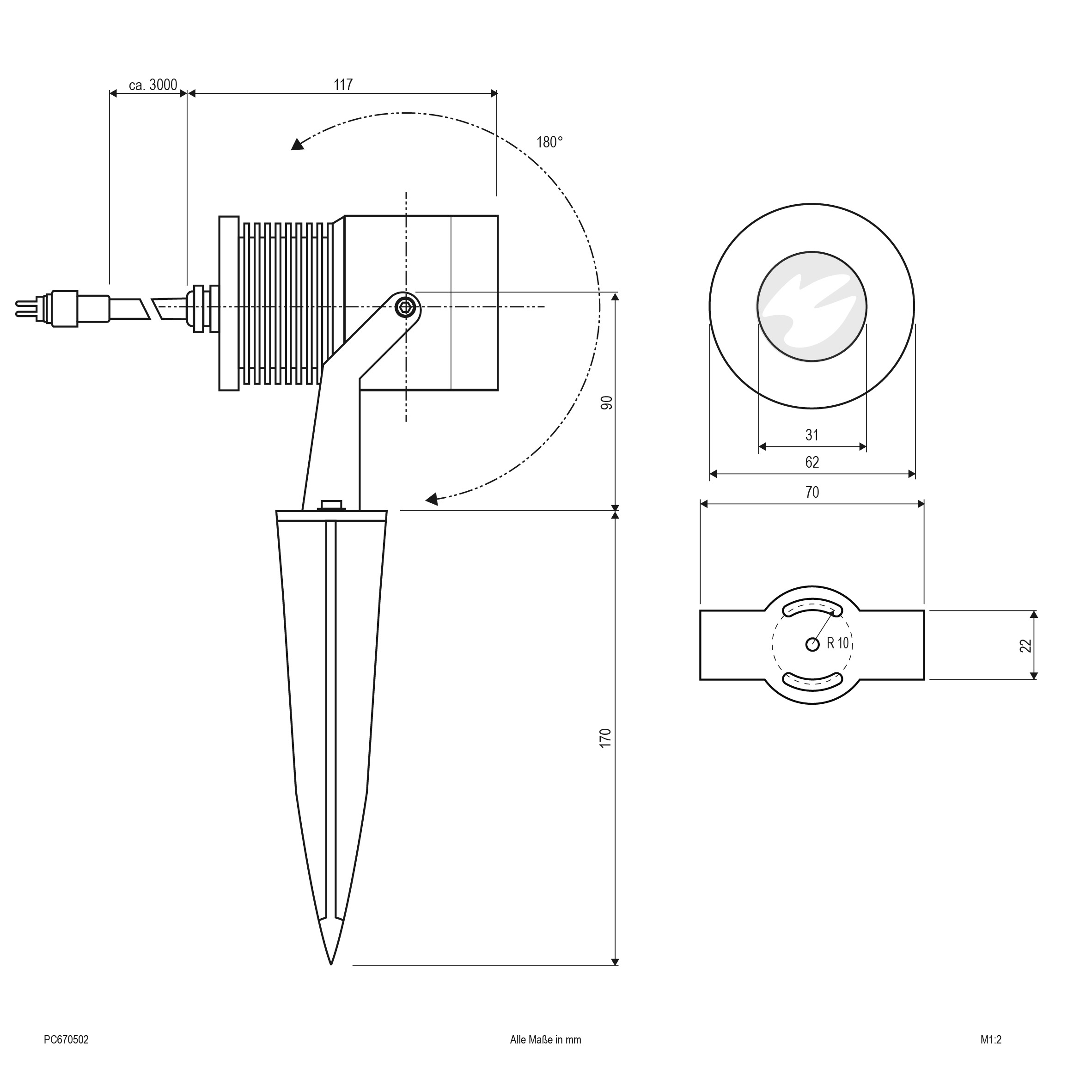 Die Leuchte kann entweder mittels des montierten Bügels direkt auf dem Untergrund, oder optional mit dem mitgeliefertem Erdspieß im weichen Untergrund montiert werden. Am Strahler befindet sich eine 3m lange Anschlussleitung mit Stecker für das IP44-Stecksystem. Die Kabeleinführung in die Leuchte erfolgt durch eine Kabelverschraubung. Dank der Vorbereitung für das Stecksystem, können problemlos auch größere Anlagen schnell und einfach installiert werden. Mit montiertem Erdspieß hat die Leuchte einen Drehbereich von 90°. Der Schwenkwinkel der Leuchte beträgt 45°. Der Erdspieß hat eine Länge von 170mm.- Hersteller-Artikelnummer (MPN)