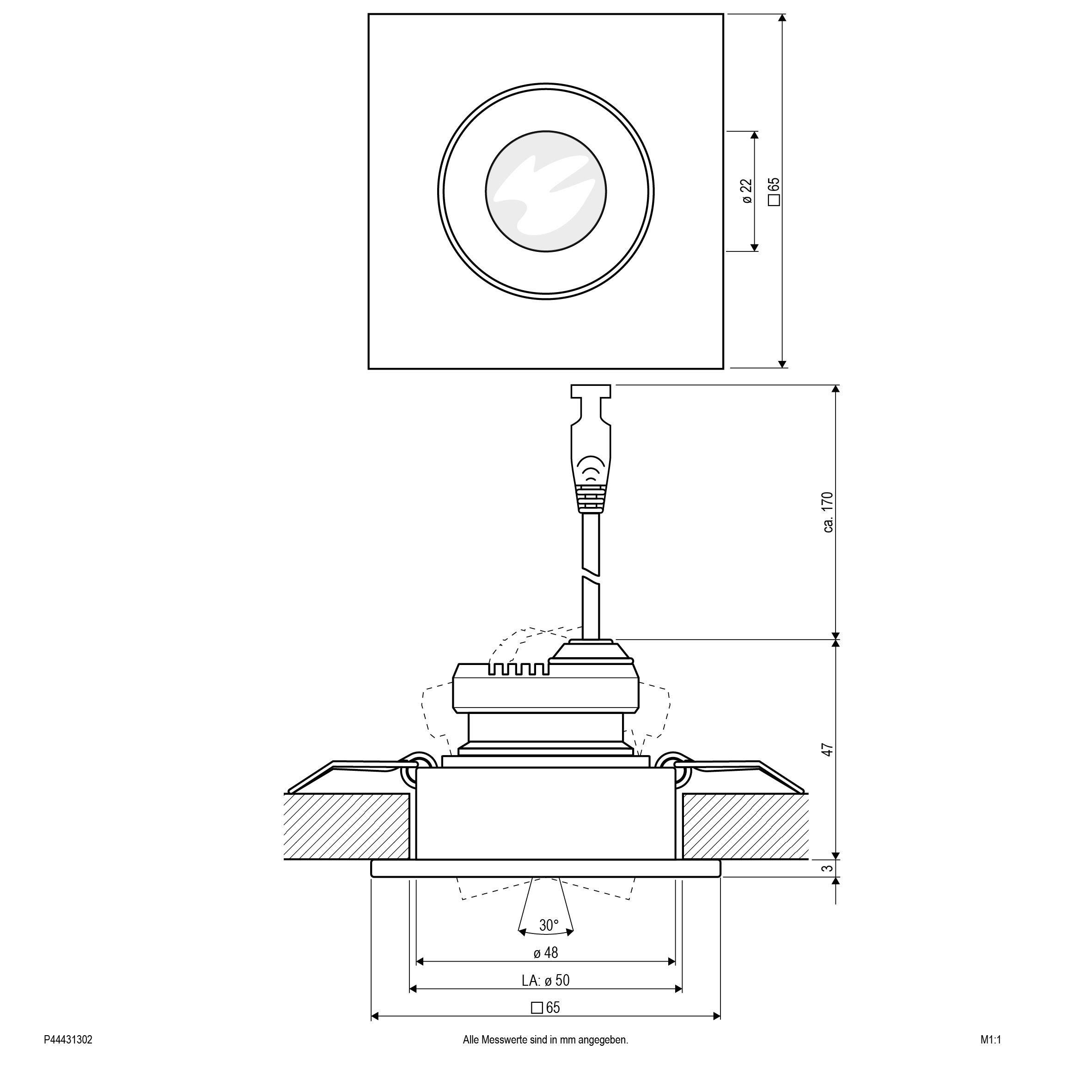 Mit der LED Deckeneinbauleuchte lassen sich vielfältige Anwendungen im Innenbereich, wie z. B. Effektbeleuchtung, Raumbeleuchtung, Akzentuierte Beleuchtung und vieles mehr realisieren. Aufgrund der gegebenen Schutzart kann die Leuchte auch im Feuchtraum und sogar im geschützten Außenbereich verbaut werden. Zusätzliche Kosten für Leuchtmittel entfallen bei dieser Leuchte, da die Leistung von einem fest verbauten LED-Chip geliefert wird. An der Leuchte befindet sich eine 1m lange Anschlussleitung. Der Schwenkwinkel beträgt 15°.