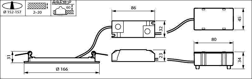 D155 mm, Aluminiumdruckguss, Weiß, Verkehrsweiß (RAL9016), Netzteil (Ein/Aus), 1100 lm, 11 W, 100 lm/W, 3000 K, (0.43657,0.40454) SDCM3, CRI80, Abstrahlungswinkel (90°), Opal, Polystyrol, IP20/44 | Fernhalten von Fingern; Drahtschutz, spritzwassergeschützt, IK02 | 0,2 J Standard, SchutzklasseII, 2-poliger Anschlussblock