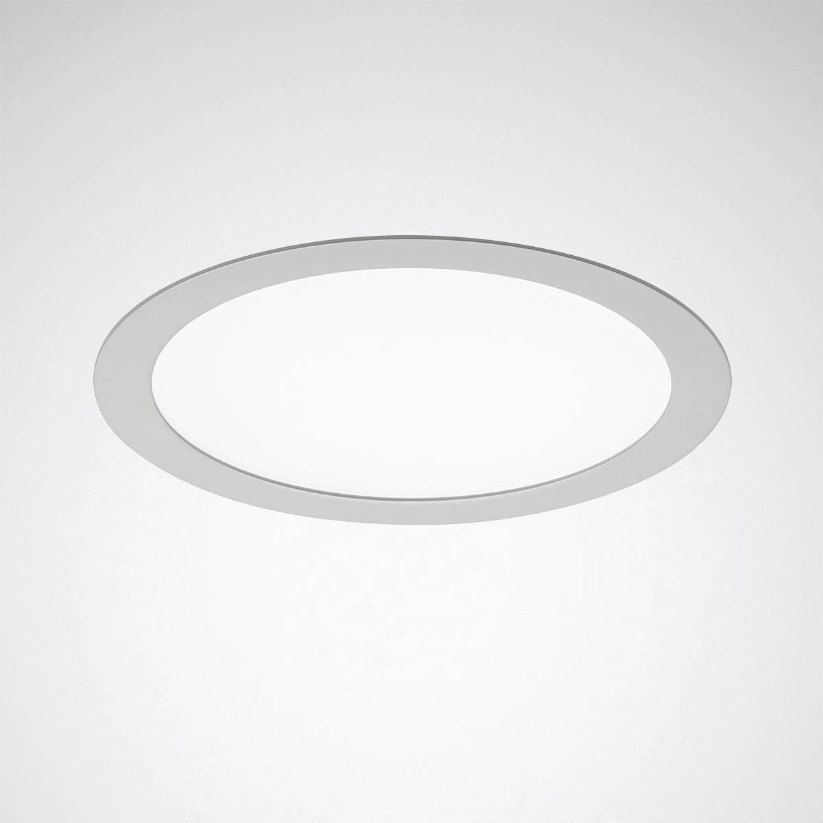 Rundes LED Einbau-Downlight. Werkzeugloser Deckeneinbau durch Schnellmontagefedern. Deckenausschnitt Ø 280 mm, Einbautiefe 30 mm. Mit opaler PMMA-Abdeckscheibe. Mit lambertscher Lichtstärkeverteilung. Leuchtenlichtstrom und Lichtfarbe fest eingestellt. Bemessungslichtstrom 2750 lm, Bemessungsleistung 30 W, maximale Leuchten-Lichtausbeute 92 lm/W. Lichtfarbe neutralweiß, ähnlichste Farbtemperatur (CCT) 4000 K, allgemeiner Farbwiedergabeindex (CRI) Ra > 80. Farborttoleranz (initial MacAdam) = 4 SDCM. Leuchtenkörper aus Aluminiumdruckguss. Deckenring weiß pulverbeschichtet (ähnlich RAL 9016). Außenmaße Deckenring Ø 300 mm, Leuchtenhöhe 30 mm. Zulässige Umgebungstemperatur (ta): -20 °C - +25 °C. Schutzklasse (EN 61140): II, Schutzart (DIN EN 60529): IP20, Schutzart raumseitig: IP54, Stoßfestigkeitsgrad nach IEC 62262: IK03, Prüftemperatur Glühdrahttest gemäß IEC 60695-2-11: 650 °C. Gewicht: 0,9 kg. Mit externem Betriebsgerät, schaltbar. Das Betriebsgerät ist entsprechend der Ökodesign-Anforderungen (VO (EU) 2019/2020) austauschbar. Das Produkt erfüllt die grundlegenden Anforderungen der anwendbaren EU-Richtlinien und des Produktsicherheitsgesetzes und trägt die CE-Kennzeichnung. Zusätzlich ist die Leuchte durch eine unabhängige Prüfstelle ENEC-zertifiziert.