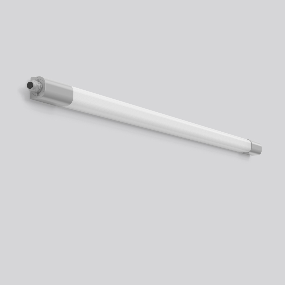 Feuchtraumleuchte mit schlanker und flacher Gehäuseform. Seitenteile Kunststoff (Polycarbonat) grau, schlagzäh. Diffusor aus Kunststoff (Polycarbonat) opal, schlagzäh. Diffusor extrudiert, innenprismatisch und UV-beständig. Lichtverteilung symmetrisch. Homogene Ausleuchtung. Rückwärtiger Lichtanteil zur Deckenaufhellung. Flexible Installation durch verschiebbare Montagebügel. Ideal bei Leuchtenaustausch. Deckenmontagebügel aus Edelstahl und Triangel-Bügel für Pendelmontage im Lieferumfang enthalten. Betriebsgerät gekapselt, integriert und fest verbunden mit dem Diffusor und Seitenteil. Leuchte mit integrierter Durchgangsverdrahtung für das Aneinanderreihen von weiteren Leuchten. Komfortable Leitungseinführung über Kabelverschraubungen. Einfache Installation durch Drehverschluss auf beiden Seiten. Leuchte mit begrenzter Oberflächentemperatur nach DIN EN 60598-2-24 zur Verwendung in einer Umgebung, in der eine Ablagerung von leitfähigem Staub auf der Leuchte erwartet werden kann. Zugelassen für den Einsatz in der Lebensmittel, und Getränkeindustrie.