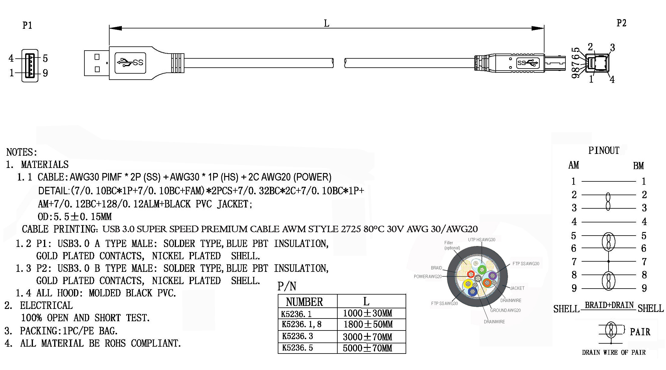 USB-Verbindungskabel A-B 5,0m USB 3.0 schwarz K5236.5