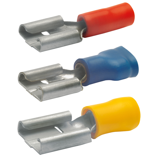Für fein- und feinstdrähtige Leiter. Isoliert, halogenfrei. Querschnittabhängige Farbkodierung. 4,8x0,5 mm, 0,5-1 mm². Temperaturbeständigkeit bei 70° C. Verzinnt. Werkstoff CuZn (Messing). Isolierhülse: PVC.