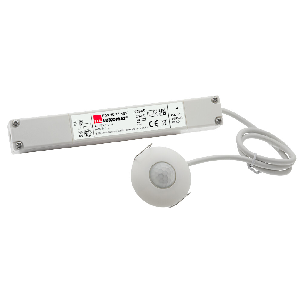 Mini-Bewegungsmelder mit einer Betriebsspannung von 12-48 V, Ein Kanal zum Schalten von Licht, Einfache Einstellung am Gerät, Leistungsteil passt durch die Bohrung für den Melder in der Decke (bei 34 mm d. ), Federklemmen für den einfachen und schnellen Einbau in abgehängte Decken und in Leuchten, Inklusive d. 45 mm Abdeckring und Abdecklamellen