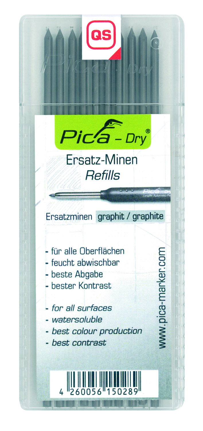 Pica dry Baumarker-Graphit zum Markieren, Anzeichnen und Beschriften auch an schwer zugänglichen Stellen. Schreibt auf fast allen Materialien, sogar auf staubigen, rauen und öligen Oberflächen. Feucht abwischbar auf glatten Flächen. Die Minen werden durch ein Edelstahlrohr geschützt und mittels Druckmechanismus nachgeschoben. Der praktische Aufbewahrungsköcher dient gleichzeitig als Anspitzer. Ausführung Stift mit Graphitmine B2 (Allesschreiber). Ersatzminen zu Cimco-Artikelnr. 21 2151, wasserlöslich; 10er Pack, Graphit B2