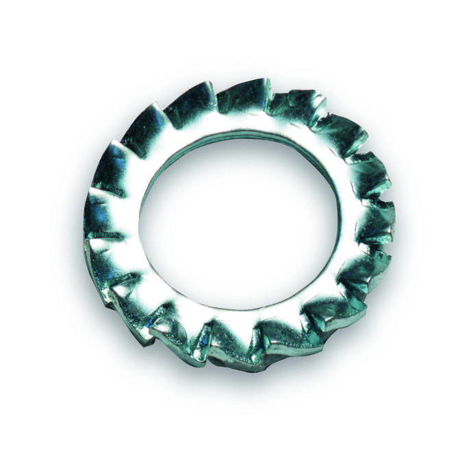 Fächerscheibe nach DIN 6798 Form A außengezahnt, aus Stahl und verzinkt. Ausführung: für Schrauben: M6; Innen-Ø: 6,4 mm; Außen-Ø: 11 mm; VE: 100.