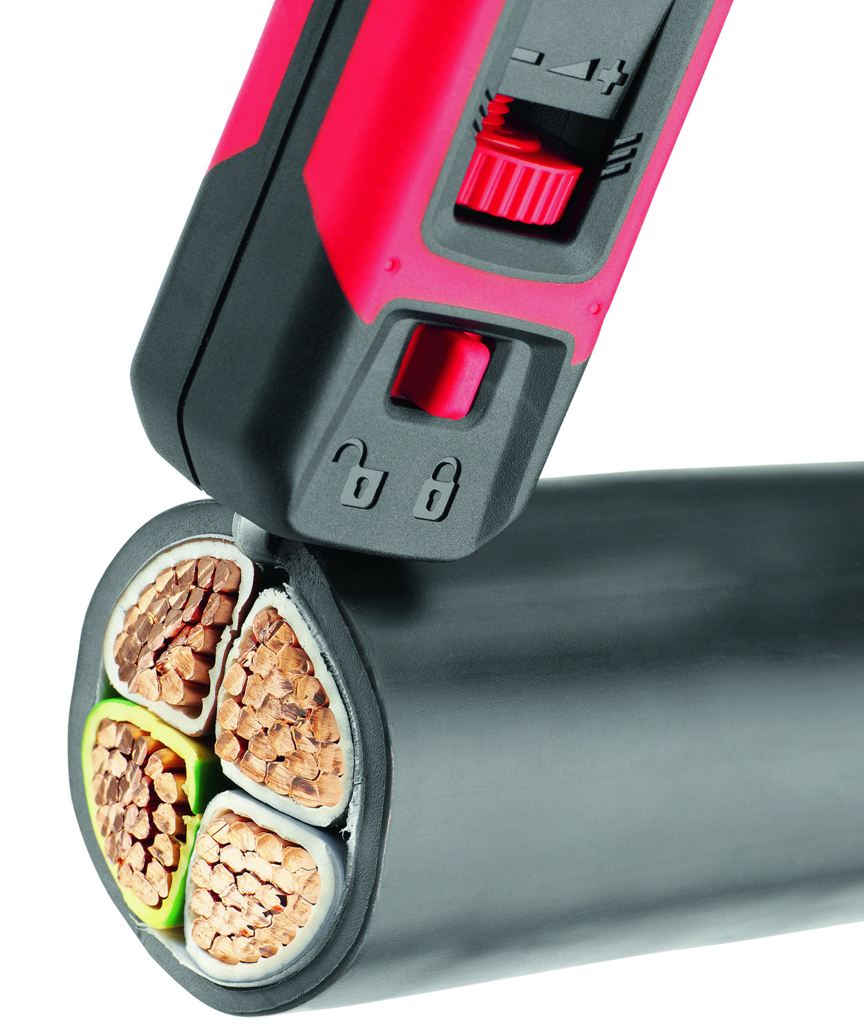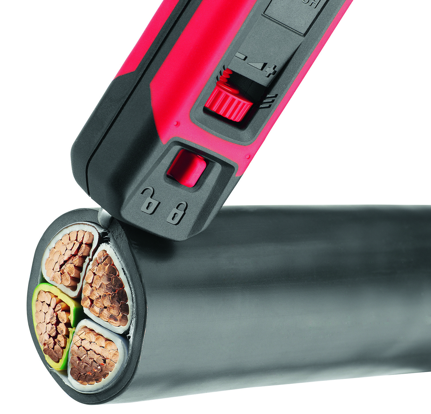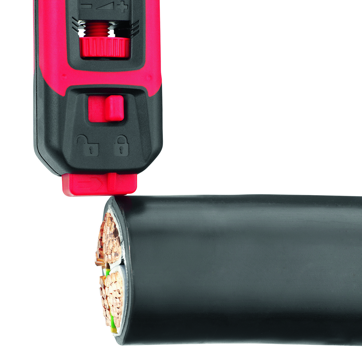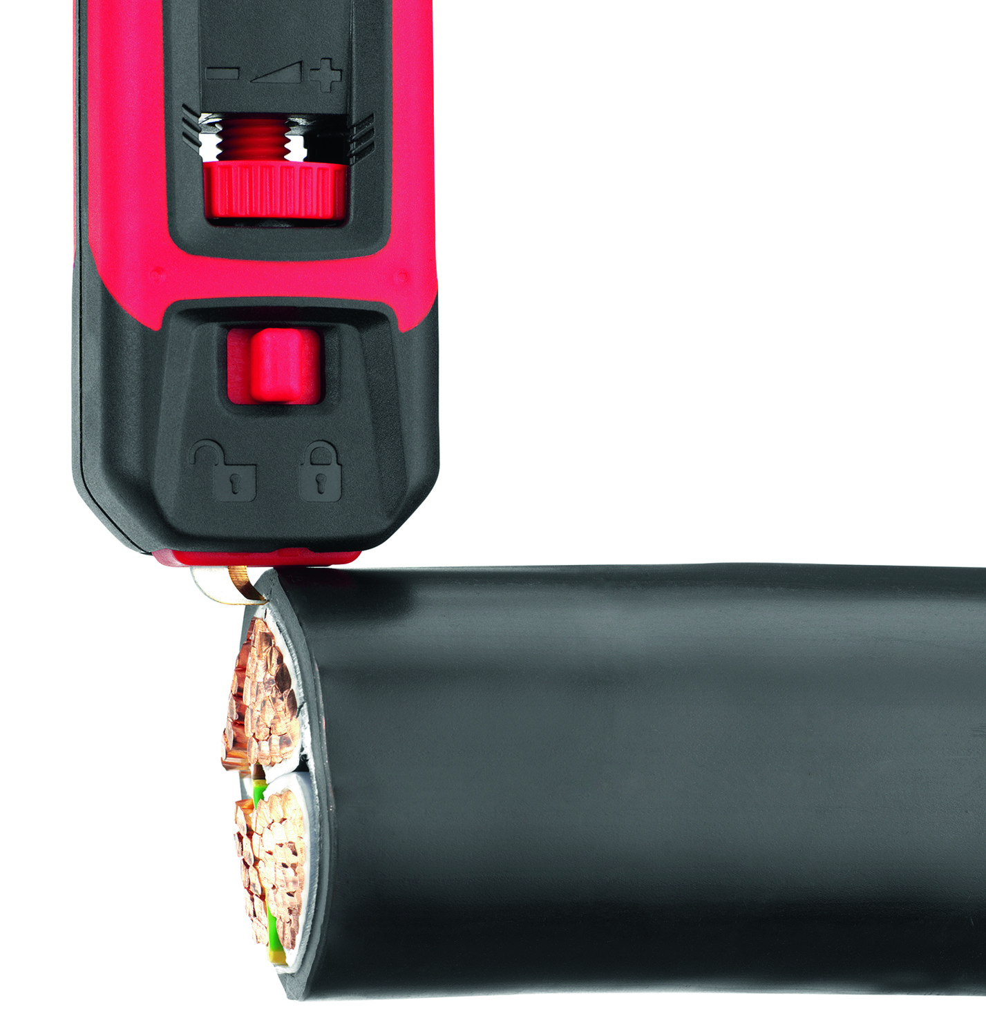 Jokari®Kabelmesser System 4-70 mit mit wechselbaren Bügeln und TiN-beschichteter Sicherheitsklinge. 2-KomponentenWerkzeug mit verbesserter Ergonomie zur besseren Führung während des Abmantelvorganges und verletzungsfreiem Arbeiten. Bügelsystem ohne Zuhilfenahme von Werkzeug einfachst auszuwechseln; Bügelgröße im Auslieferungszustand für Kabeldurchmesser 8 28 mm. Einstellbares und skalierbares Innenmesser für Längs- und Rundschnitt. Geschützte Hakenklinge mit einstellbarer Tiefe; automatischer Schutzmechanismus um beim ungewollten Abrutschen Schnittverletzungen zu vermeiden. TÜV/GS geprüft. Ausführung bis zu einem ø von 8-28 mm