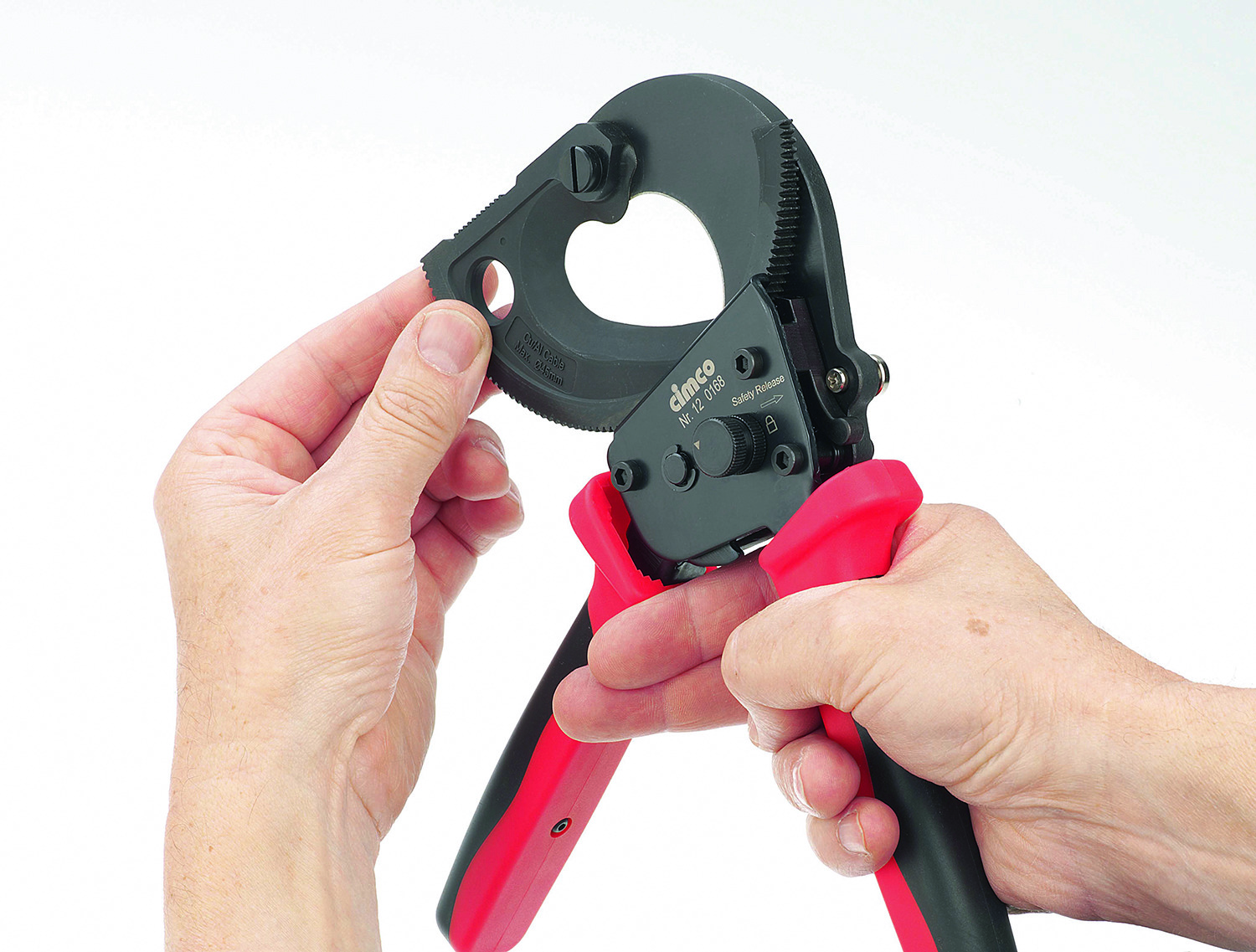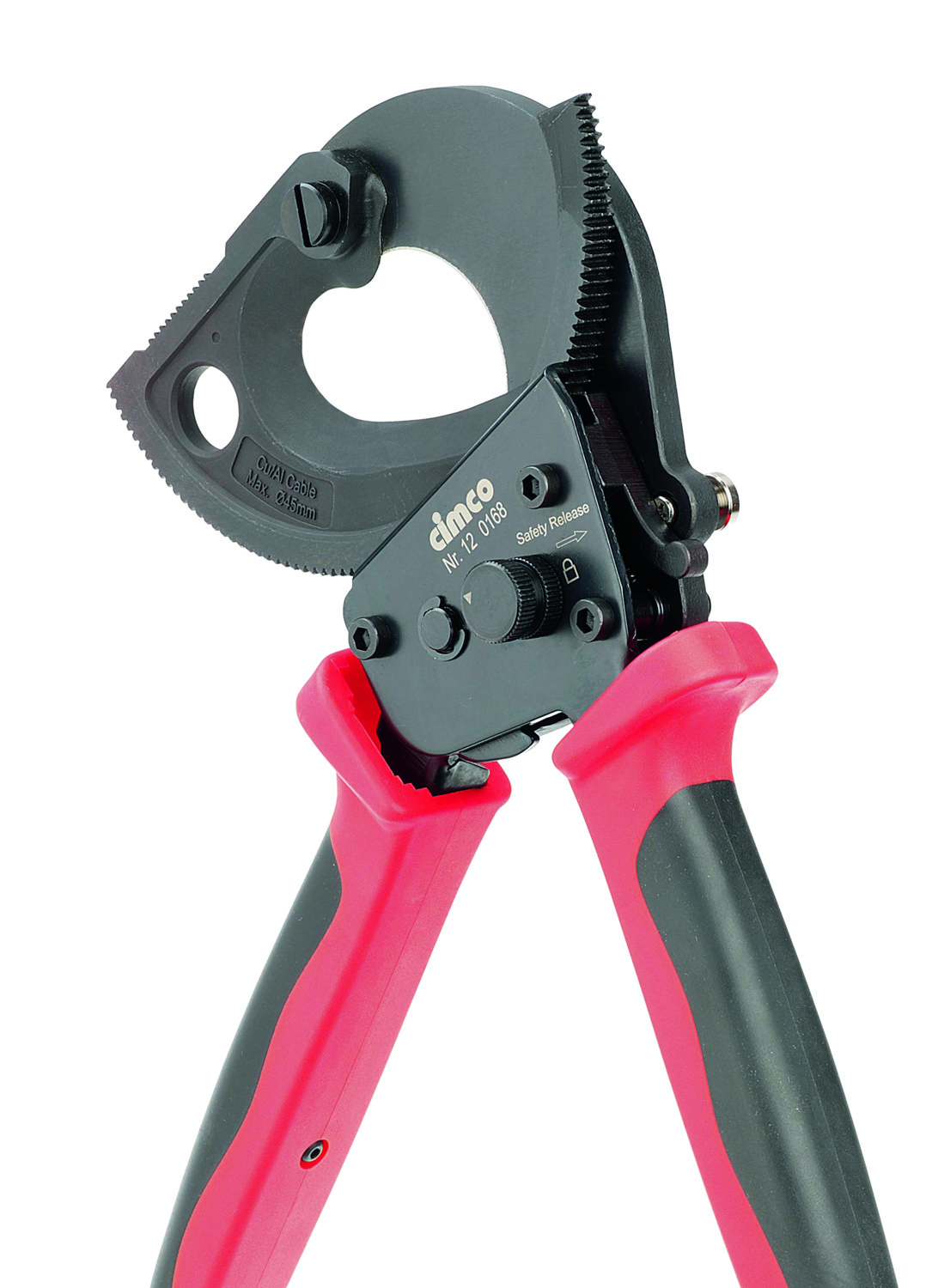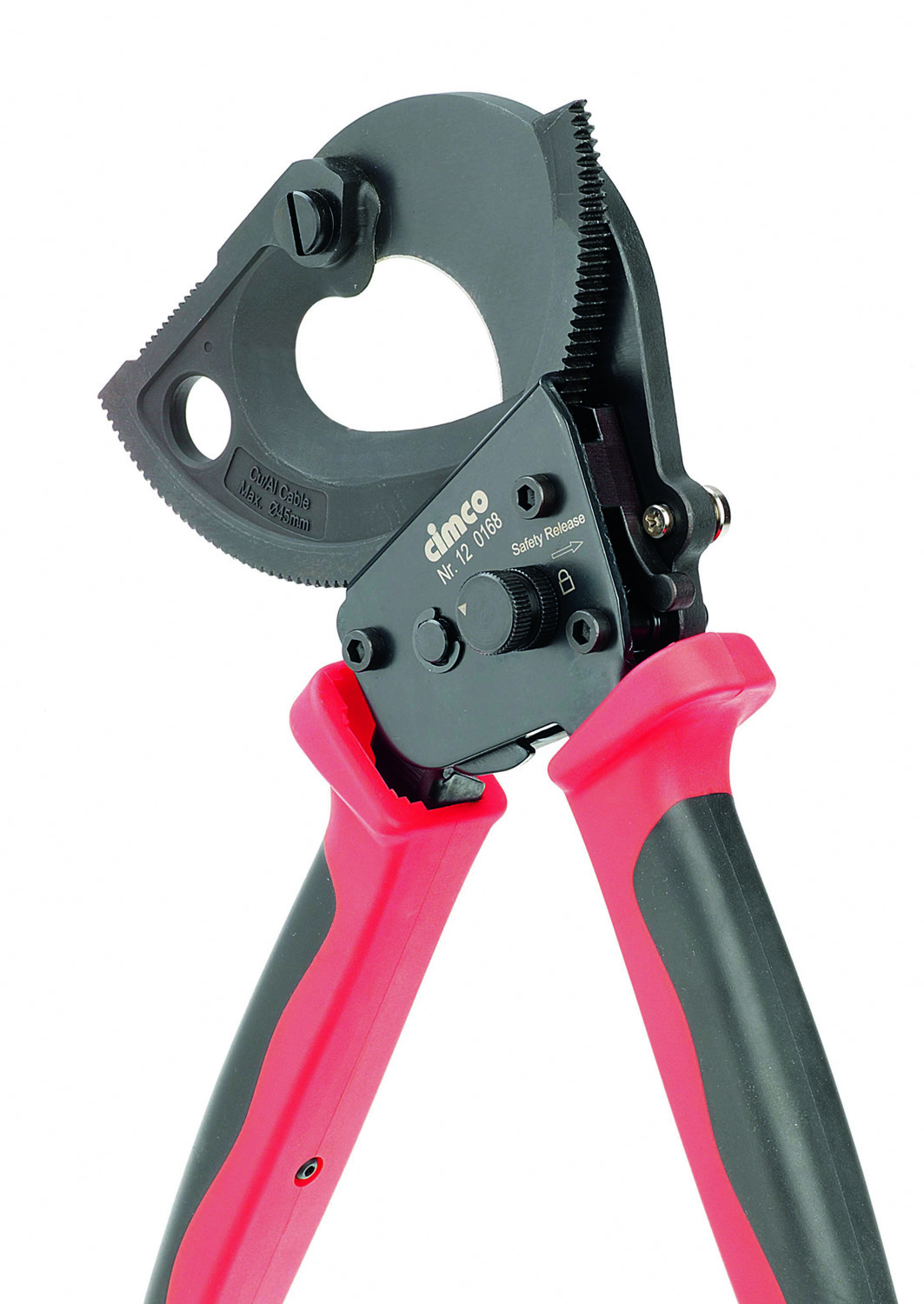 Einhand-Ratschen-Kabelschneider zum quetschfreien Schneiden von Kabeln mit einem Außendurchmesser von max. 45 mm. Geeignet für Kupfer- und Aluminiumkabel, nicht geeignet für Stahldraht, stahlarmierte Kabel und hartgezogene Cu- und Bz-Leiter. Sauberer Schnitt durch scharfe spezialgehärtete Schneiden, trotz kompakter Bauform dank Ratschenmechanik mit nadelgelagerter Exzenterübersetzung und ergonomischen Handgriffen mit geringerÖffnungsweite nur mit einer Hand kraftschonend bedienbar. Die Handgriffe sind jedoch lang genug, um bei Lastspitzen die zweite Hand unterstützend einzusetzen. Gewicht nur 980 g. Bewegliche, voll durchschwenkbare und in jeder Stellung entriegelbare Schneide, leicht austauschbar (Ersatzschwenkmesser Cimco-Artikelnr. 12 9168), Arretierung der Griffe über Drehknopf (rote Markierung), leichteÖffnung der Schneidmesser durch in Offenstellung arretierbarer Sperrklinke. Max. Schneidleistungen Cu ( Kupfer ) max. Ø 45 mm, mehrdrähtig 300 mm² / 600 mCM, Sektorleiter 3x70SM; AL (Aluminium max. Ø 45 mm, mehrdrähtig 400 mm² / 800 MCM; Sektorleiter 4x70 SE- Hersteller-Artikelnummer (MPN)