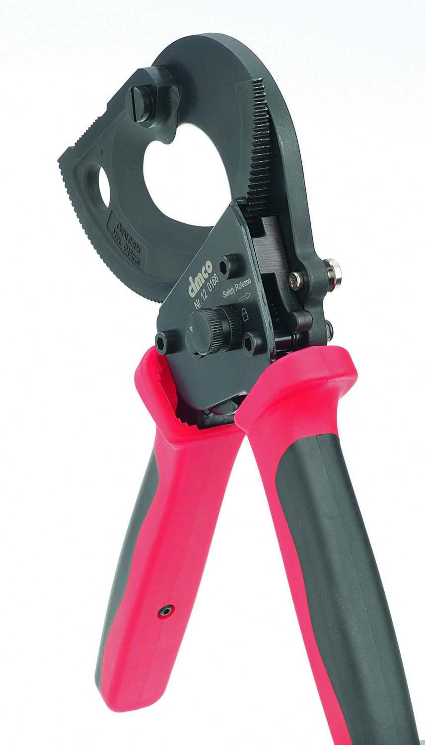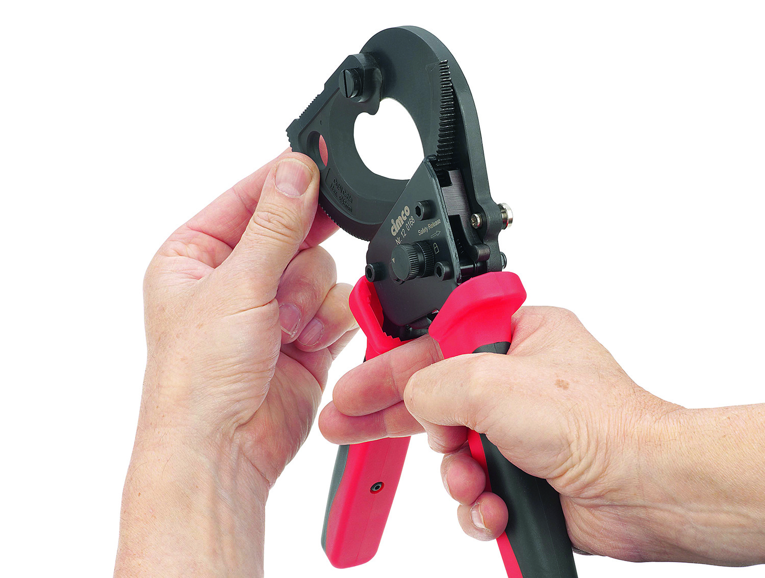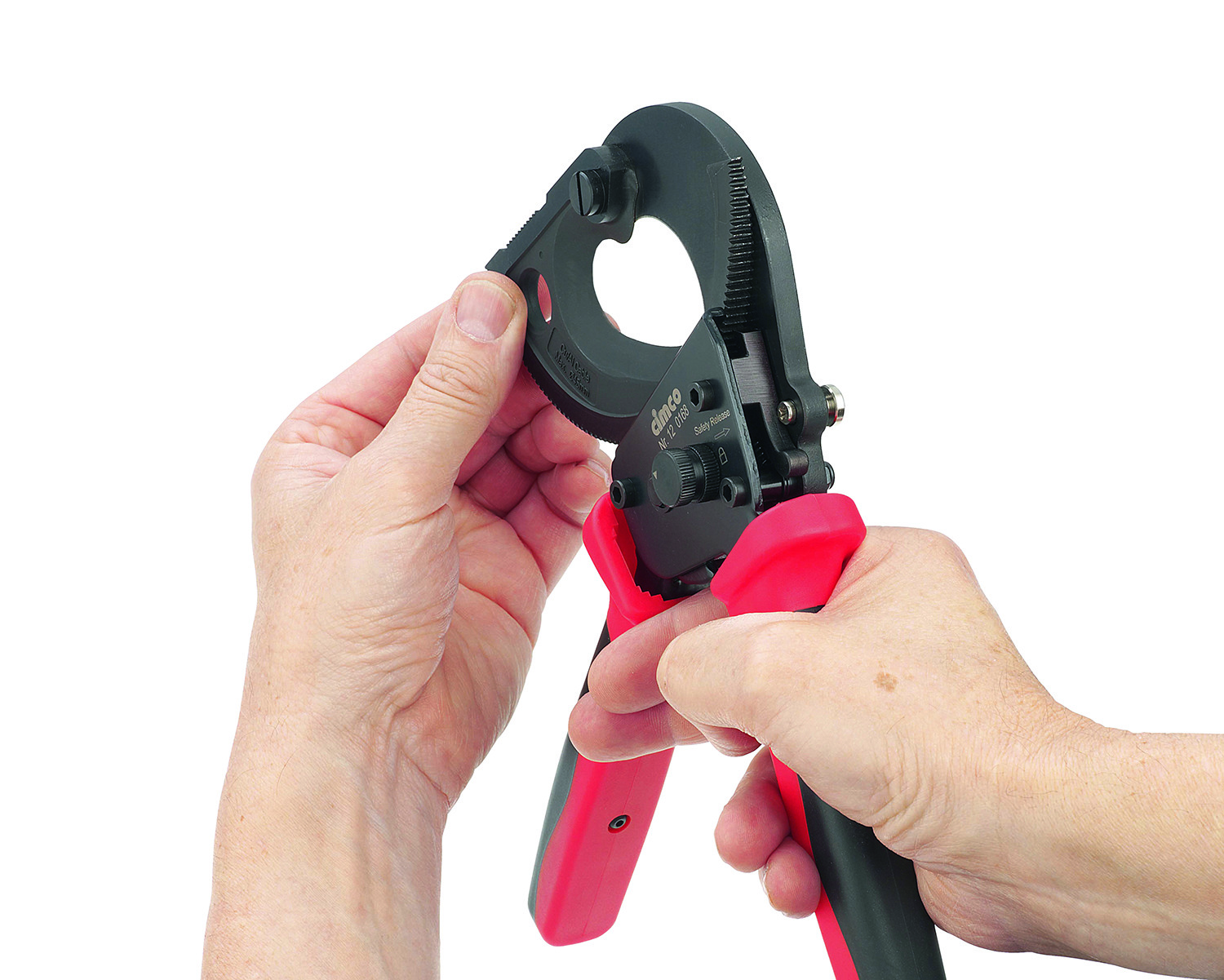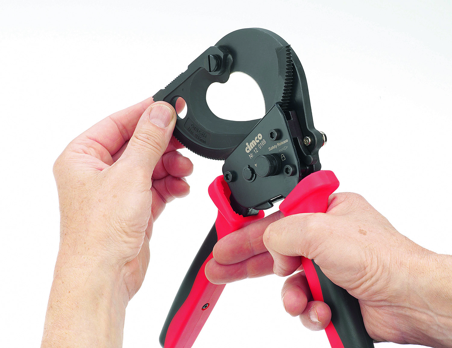 Einhand-Ratschen-Kabelschneider zum quetschfreien Schneiden von Kabeln mit einem Außendurchmesser von max. 45 mm. Geeignet für Kupfer- und Aluminiumkabel, nicht geeignet für Stahldraht, stahlarmierte Kabel und hartgezogene Cu- und Bz-Leiter. Sauberer Schnitt durch scharfe spezialgehärtete Schneiden, trotz kompakter Bauform dank Ratschenmechanik mit nadelgelagerter Exzenterübersetzung und ergonomischen Handgriffen mit geringerÖffnungsweite nur mit einer Hand kraftschonend bedienbar. Die Handgriffe sind jedoch lang genug, um bei Lastspitzen die zweite Hand unterstützend einzusetzen. Gewicht nur 980 g. Bewegliche, voll durchschwenkbare und in jeder Stellung entriegelbare Schneide, leicht austauschbar (Ersatzschwenkmesser Cimco-Artikelnr. 12 9168), Arretierung der Griffe über Drehknopf (rote Markierung), leichteÖffnung der Schneidmesser durch in Offenstellung arretierbarer Sperrklinke. Max. Schneidleistungen Cu ( Kupfer ) max. Ø 45 mm, mehrdrähtig 300 mm² / 600 mCM, Sektorleiter 3x70SM; AL (Aluminium max. Ø 45 mm, mehrdrähtig 400 mm² / 800 MCM; Sektorleiter 4x70 SE- Hersteller-Artikelnummer (MPN)