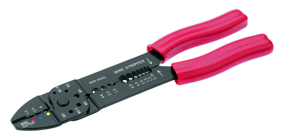Presszange Economy für isolierte und nicht isolierte Kabelschuhe, mit Draht- und Schraubenabschneider bis M 5, sowie Abisoliervorrichtung 0,5 - 6 mm², Pressung von Litze und Kabelisolation erfolgt in 2 Arbeitsgängen