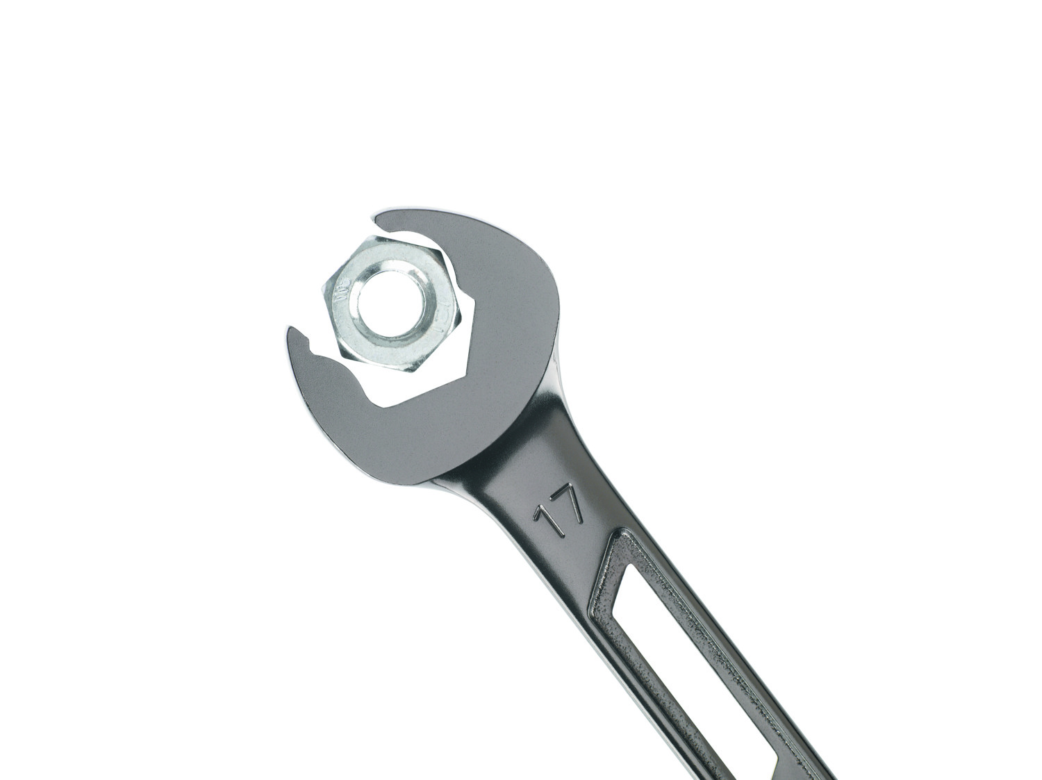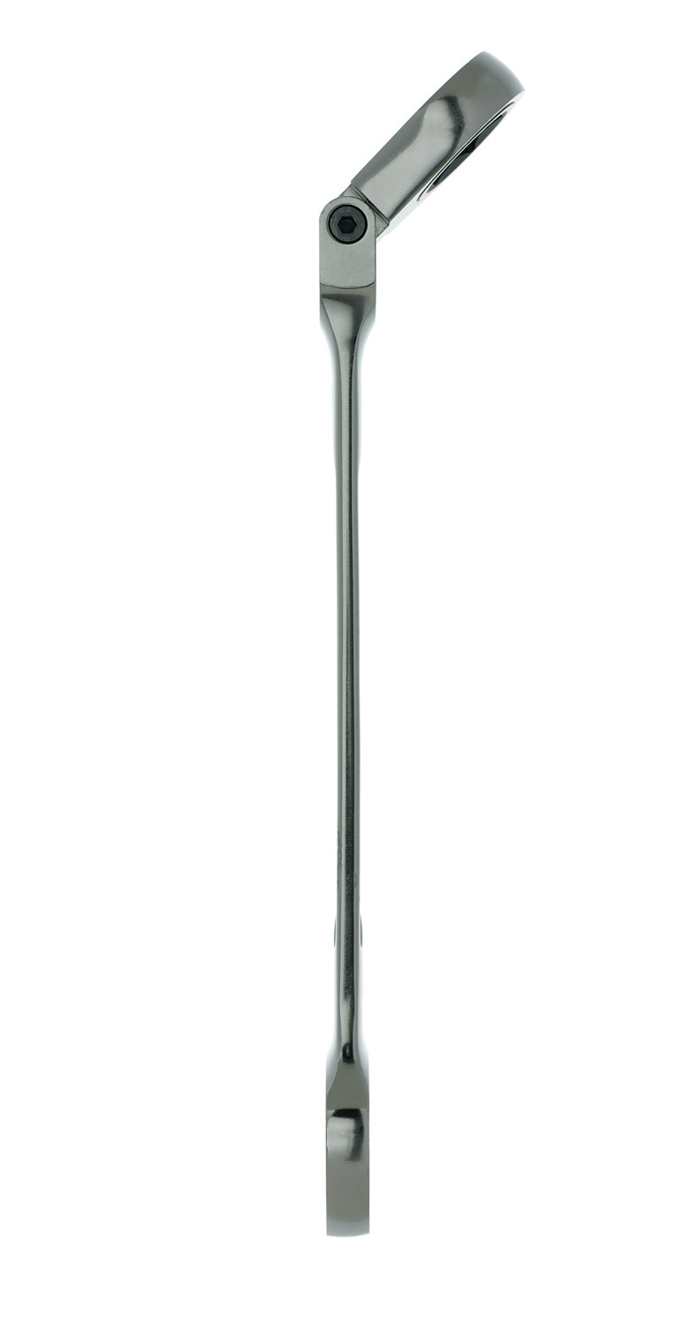 T120 FLEX Knarren-Ringmaulschlüssel-Set mit Feinstverzahnung für ratschendes Lösen oder Schnellanzug von Schrauben und Muttern in einem Zug. 120 Zähne stehen für höchste Performance und minimalste Rückholwinkel bereits ab 3°. Ringschlüssel-Element um 2x90° schwenkbar für Arbeiten von oben oder in beengten Bauräumen. Links- oder Rechtslauf durch einfaches Wenden des Schlüssels, mit zusätzlicher Farbmarkierung. Das Gabelschlüssel-Werkzeug mit der individuellen entwickelten Flanken-Geometrie ermöglicht das Zurücksetzeten des Schlüssels in de Arbeitsebene- vergleichbar mit einer Ratschenfunktion ist kein Abheben des Gabelschlüssels erforderlich! Ergonomisches Griff-Design mit nur 3 mm Bauhöhe für hervorragende Kraftübertragung. Aus Chrom-Vanadium-Stahl, spezielgehärtet. Oberfläche vernickelt matt schwarz. Set SW 8/10/13/17/19 + Werkzeug-Rolltasche.- Hersteller-Artikelnummer (MPN)